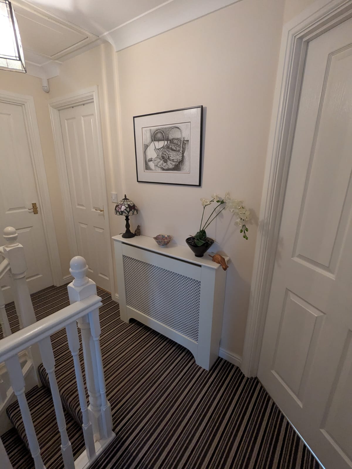 Carpet landing with smooth walls, coat ceiling and loft hatch. Doors off to 4 four bedrooms, two airing cupboards and family bathroom