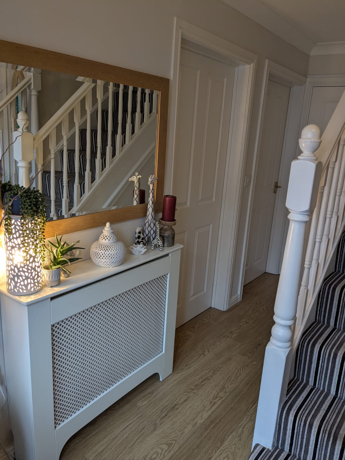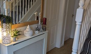 Hallway accessed via front door with matching side panels. Laminate floor. Central carpeted stairs to the first floor. Radiator. Doors off to under stair storage cupboard, WC, lounge, dining room and kitchen. Alarm panel for an annually serviced alarm system (SGD).