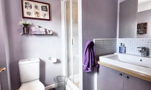 Ensuite with shower cubicle which is fully tiled and has a thermostatic shower inset. Close coupled WC with button flush and large wash basin set into vanity unit. Laminate floor, radiator plus front aspect window. Inset ceiling lights and extractor.