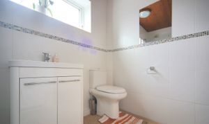 Ascending the staircase, the first floor unveils a well-appointed master bedroom adorned with built-in wardrobes, ensuring ample storage space. A second bedroom awaits, offering versatility for guests or inhabitants alike.
