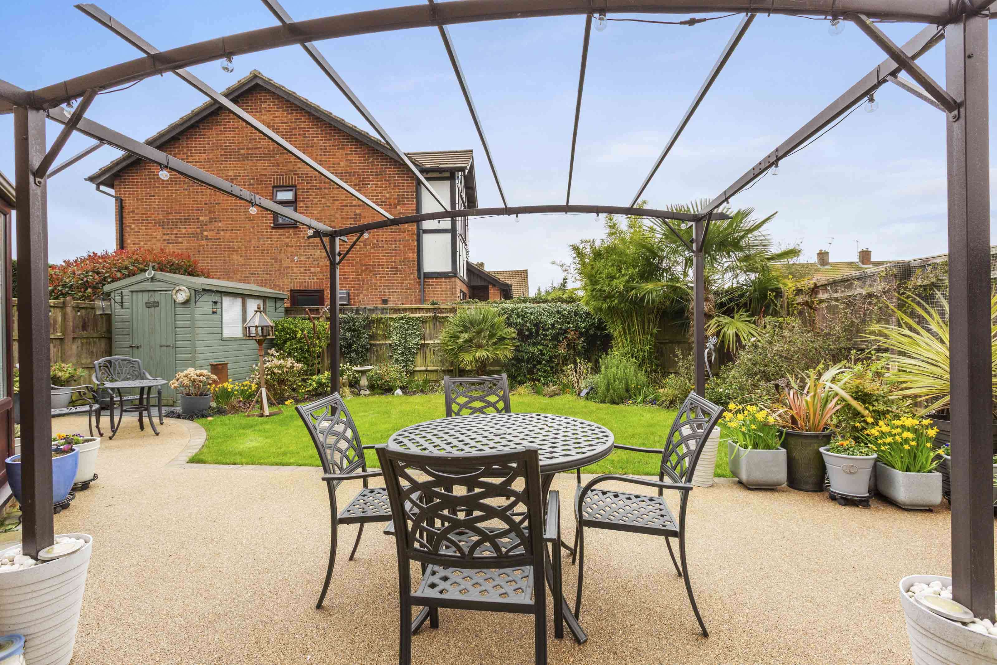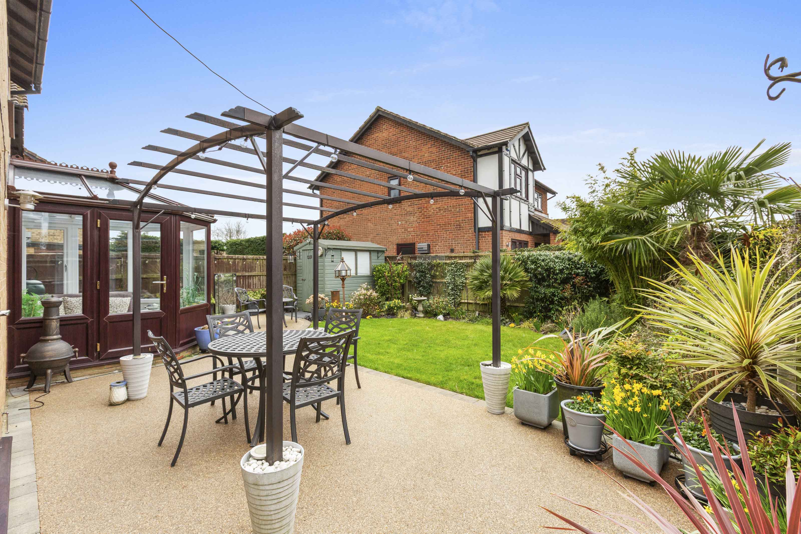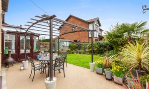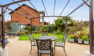 - Delightful landscaped rear garden with large resin patio area leading to a level lawn, flanked by mature flower borders and benefitting from three storage sheds