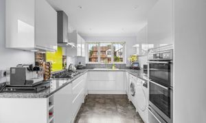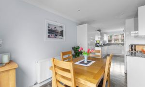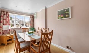 Upon entering, a bright and welcoming entrance hall greets you, complete with a coat cupboard, staircase by Neville Johnson, downstairs cloakroom and doors leading to all main reception rooms. The recently refitted kitchen/breakfast room features elegant Granite worktops and upstands, a fitted double oven with a warming drawer, a gas hob and a selection of integrated appliances, providing a stylish and functional space for family meals and entertaining. The adjoining breakfast room enjoys double doors and connects seamlessly to the sitting room, which measures an impressive 16'6 by 13'3 and boasts a charming feature fireplace alongside sliding doors leading to a light-filled conservatory. Also on the ground floor you will find the separate dining room which could easily be used as a family room.