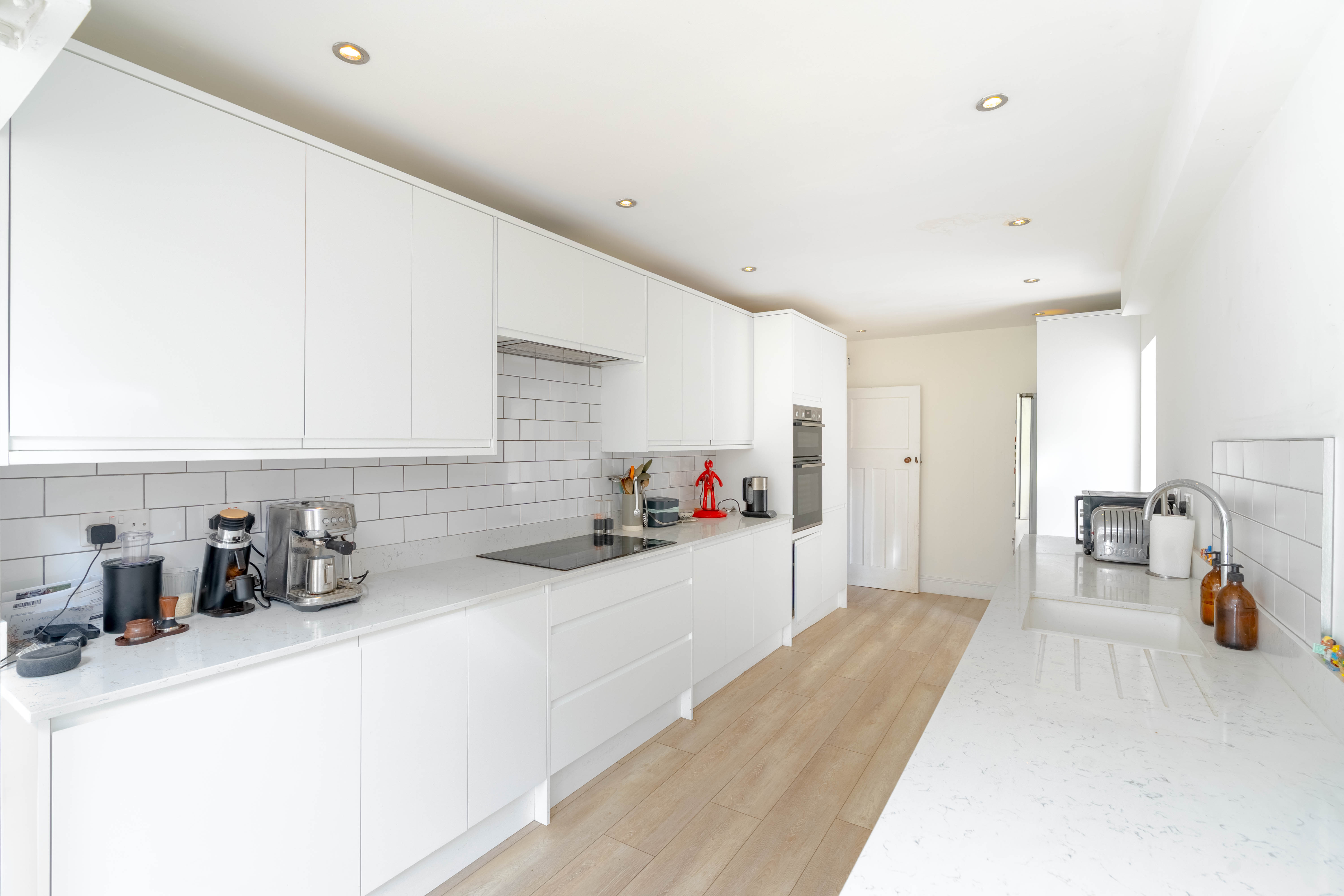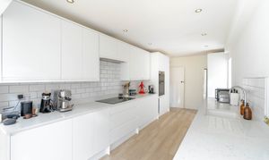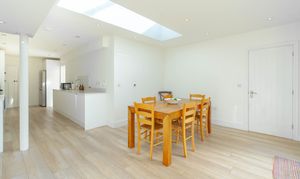 The kitchen opens into a generous kitchen-dining space, all set within one large open room ideal for both everyday family life and entertaining. Doors lead directly out to the garden, while a large Velux window positioned above the dining table floods the area with natural light and enhances the modern feel of the space.