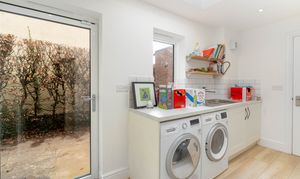 Returning to the hallway, you will find a well-proportioned study which offers great flexibility and could easily serve as a snug, guest room or additional workspace depending on your needs. From here the home flows through to the extensively extended kitchen, now forming the heart of the property. The kitchen has been designed with both space and practicality in mind, featuring several metres of built-in storage and integrated appliances, along with a substantial utility room positioned to the left for additional convenience.