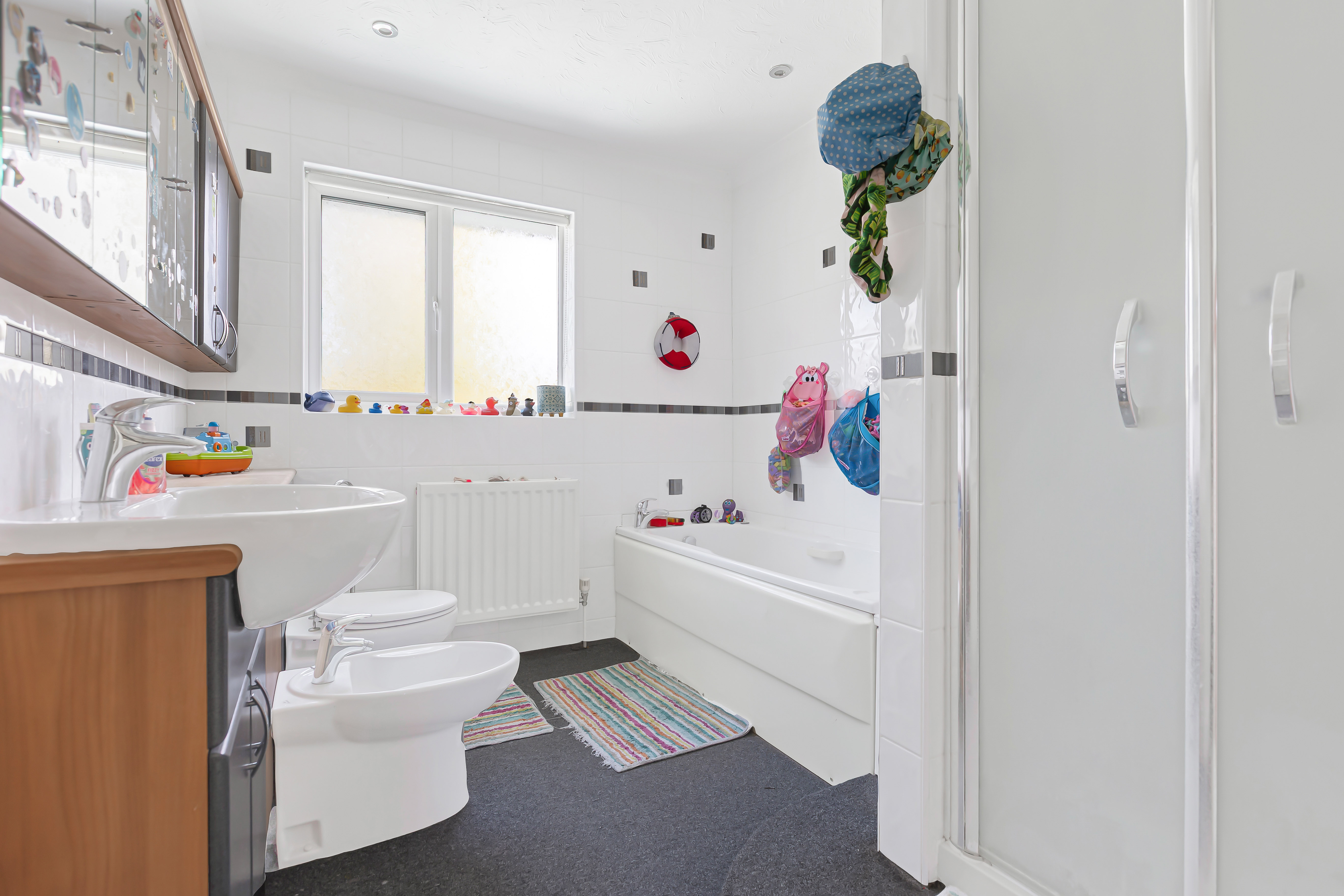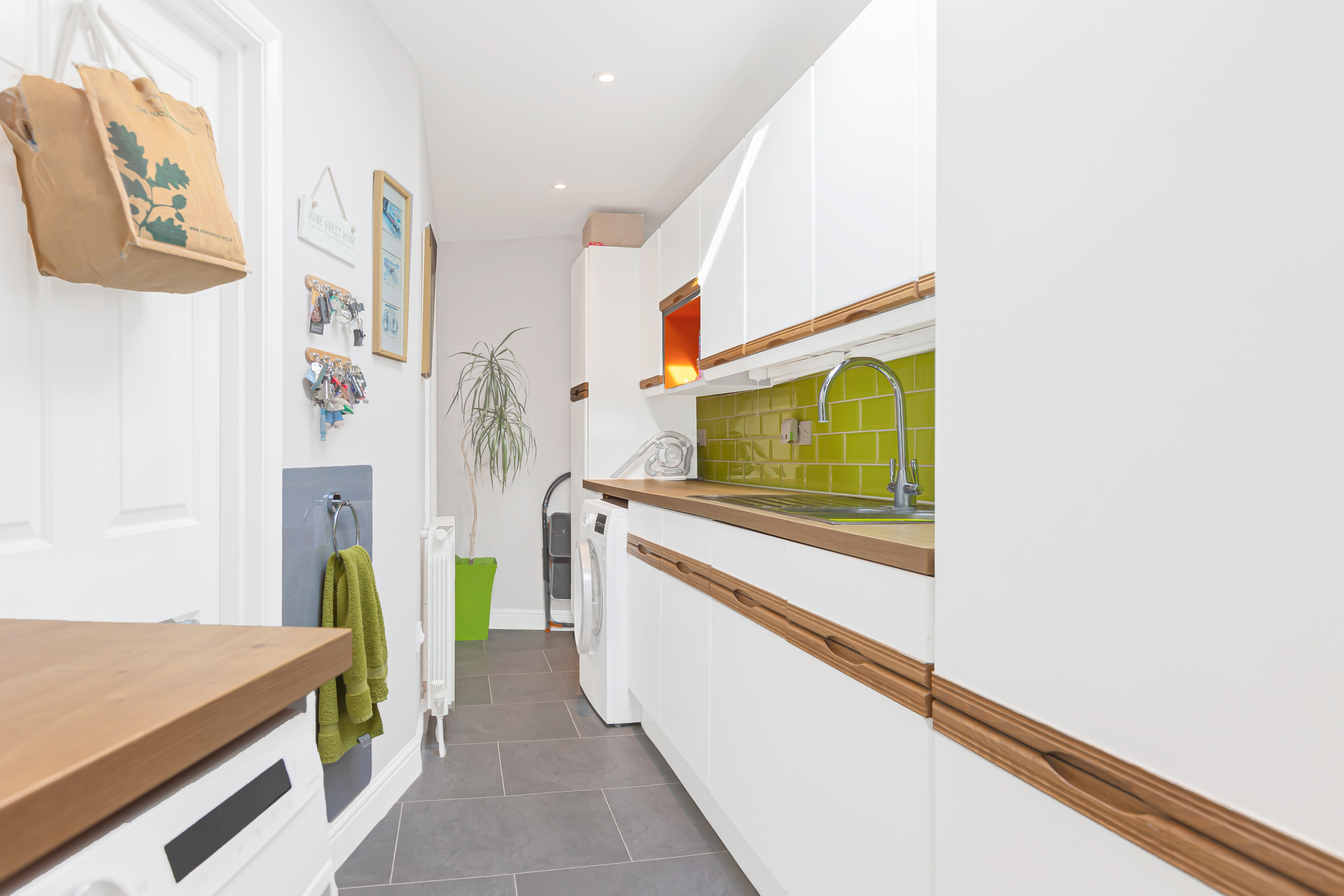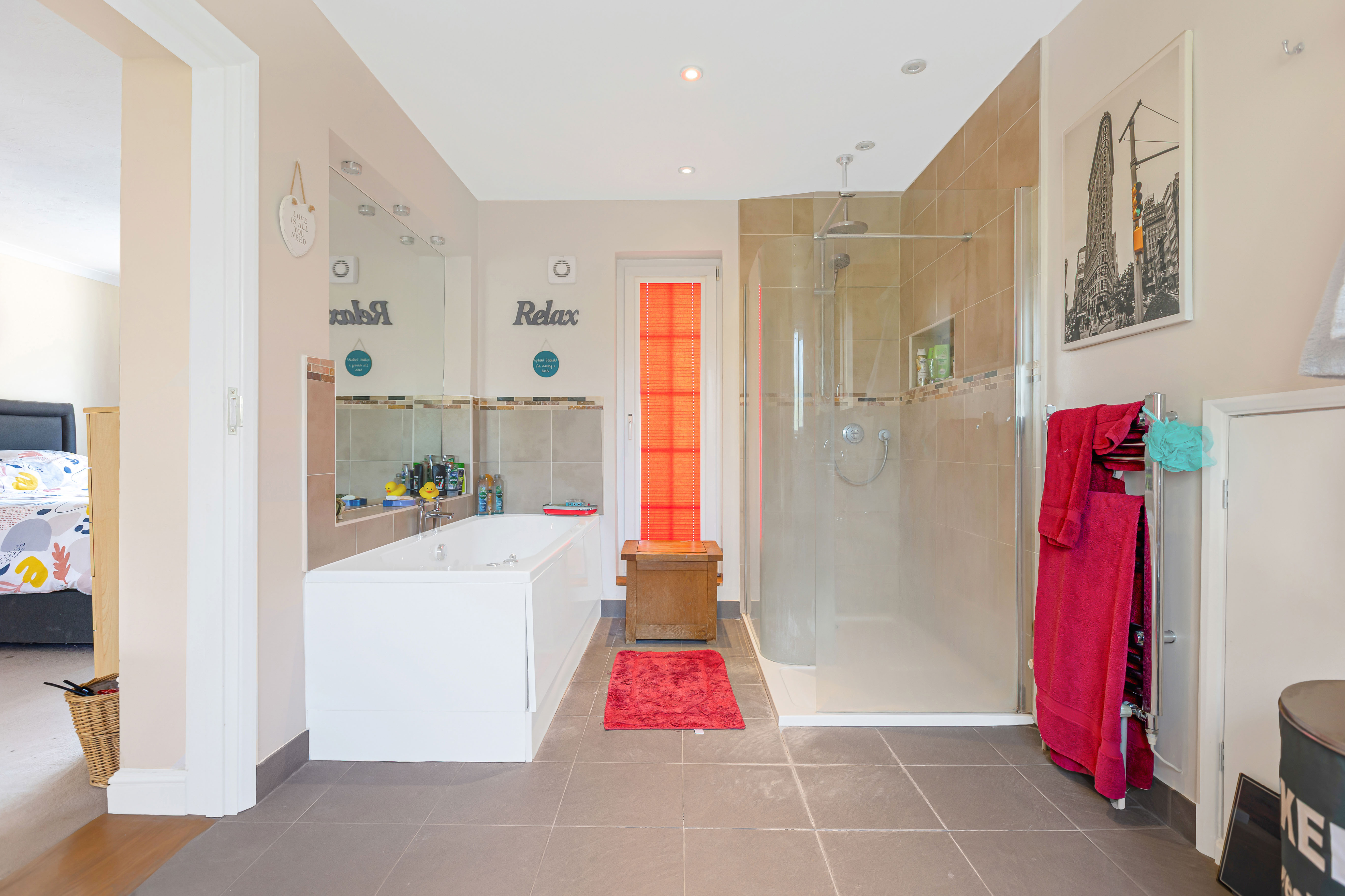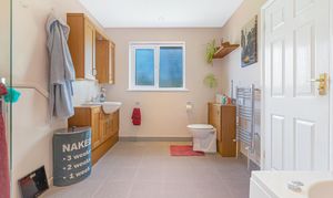 The kitchen/breakfast room is an excellent size, benefiting from a window and double French doors out onto the garden terrace, a range of base and wall units, laminate worktops, amtico flooring, tiled splashbacks, a breakfast bar, integrated double ovens, a dishwasher, a fridge/freezer, a hob and an extractor fan, and space for a dining setting and storage furniture. The utility room provides further storage, access to the rear garden and space for laundry appliances. There is also access to a large store room, which includes a powered workbench—ideal for hobbies or DIY enthusiasts. Additional practical space includes a boot room with a door to the front and a downstairs wet room comprising a shower, WC and sink.