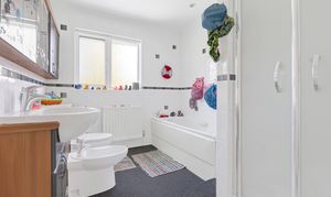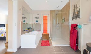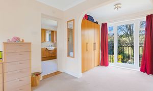 To the first floor, this impressive home continues to shine, with 5 further well-proportioned bedrooms—one of which could also serve as a study if needed—and a family bathroom with a 5-piece suite, comprising a shower, a bath, a WC, a bidet and a hand wash basin. The primary bedroom is particularly generous, enjoying its own dressing area and large en-suite, with a shower, bath, WC and sink. It also boasts a Juliet balcony that overlooks the beautifully landscaped rear garden and rolling fields beyond—perfect for peaceful morning views.