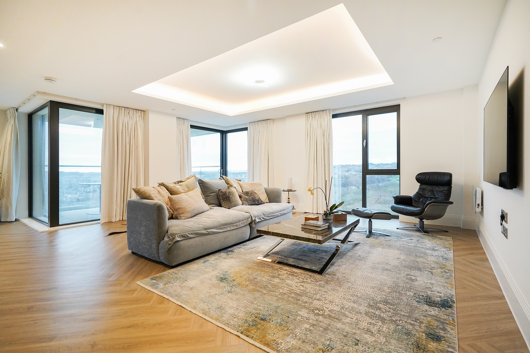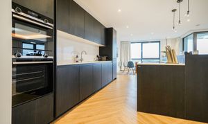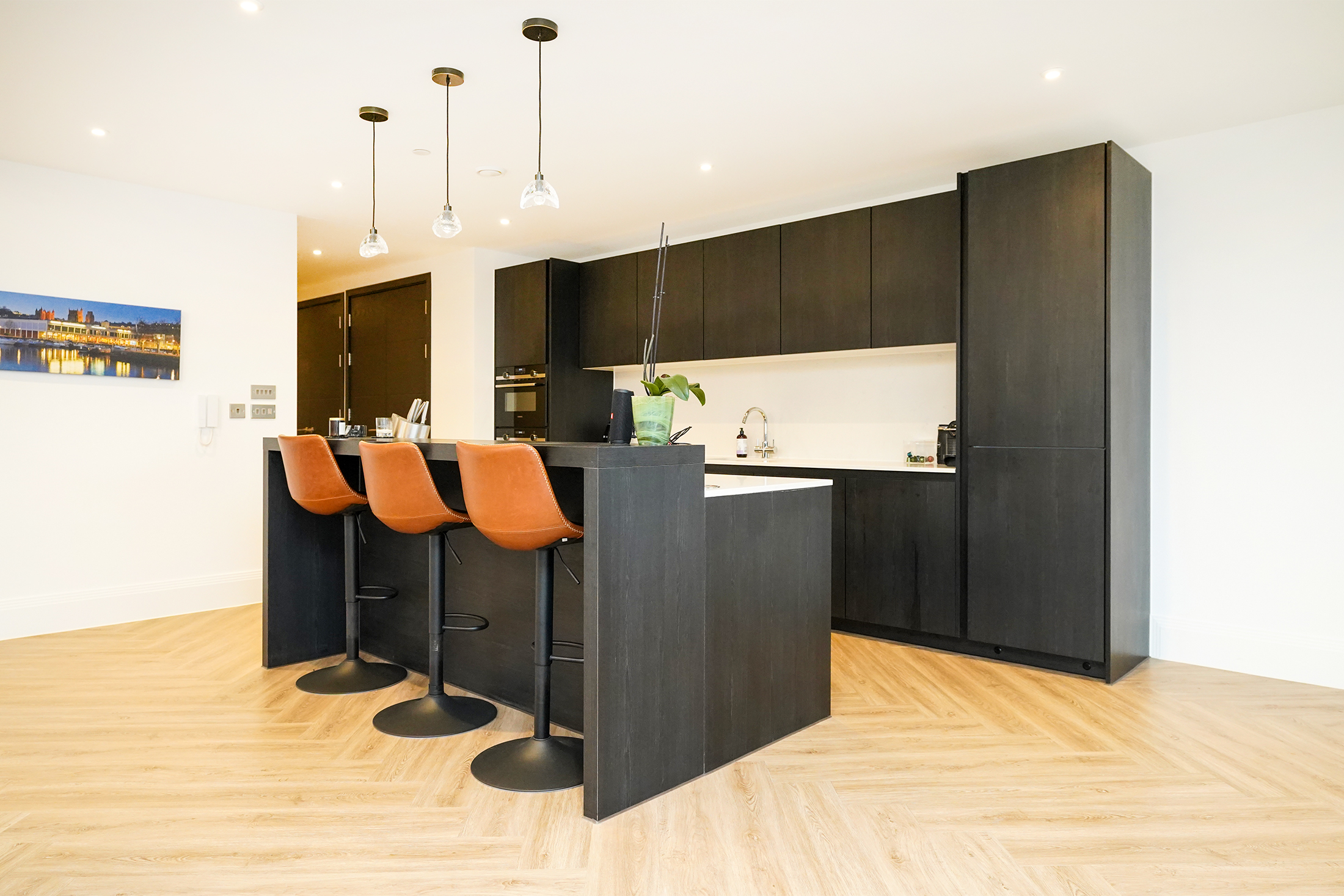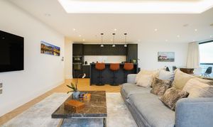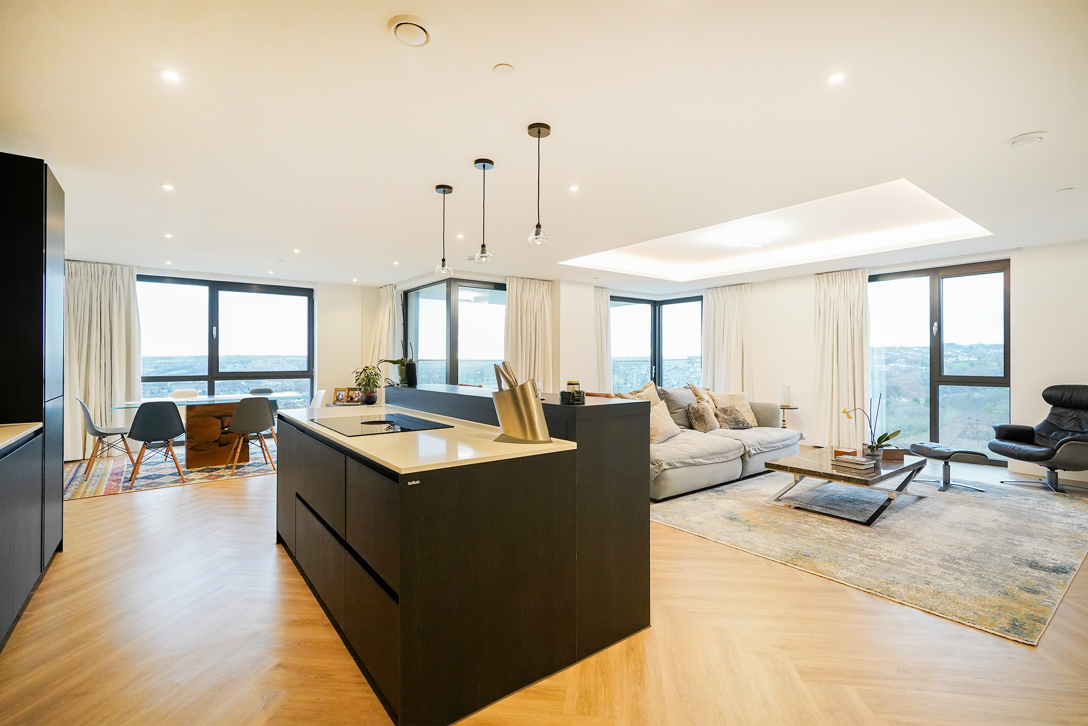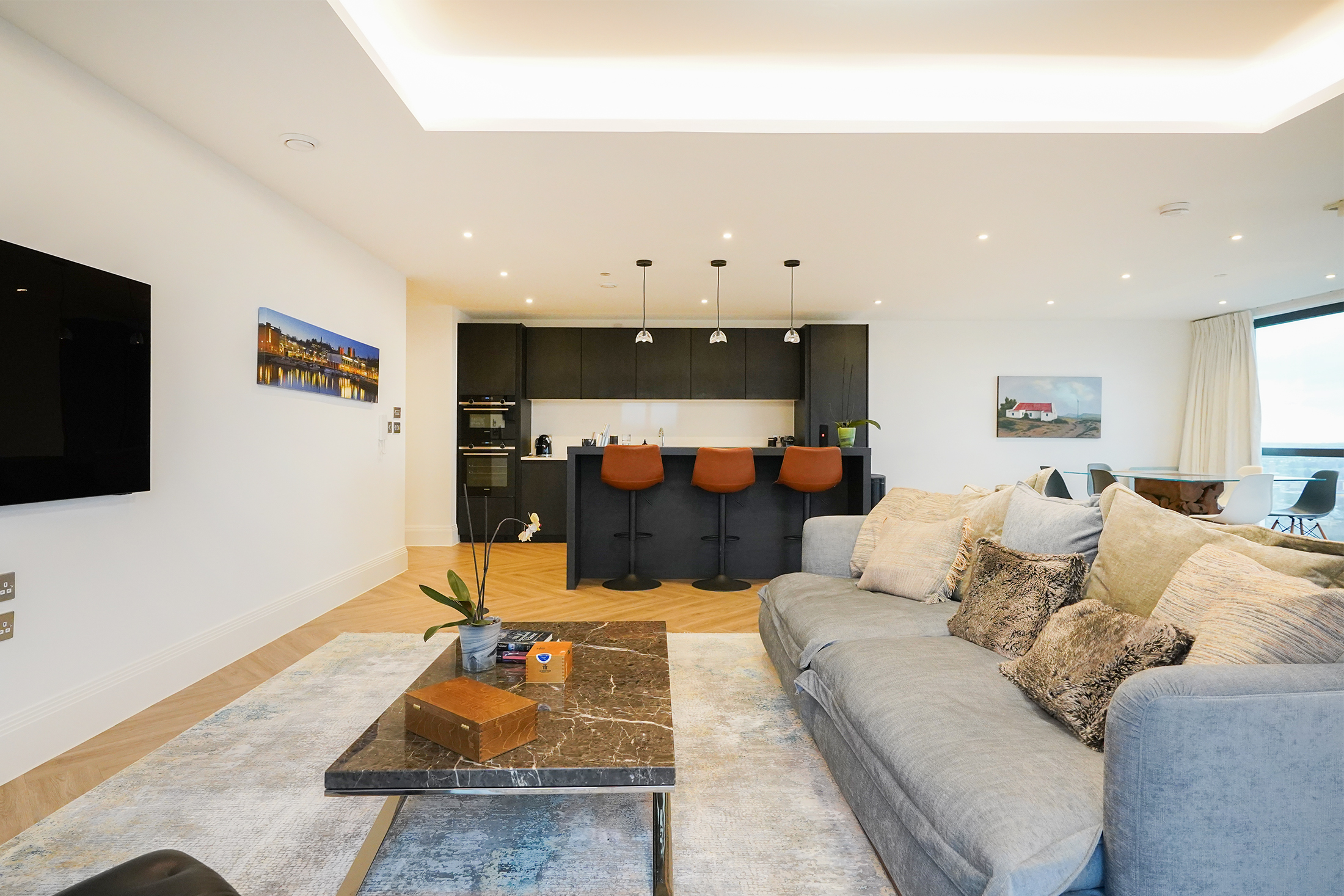 The open-plan living space benefits from floor-to-ceiling windows, allowing natural light to pour in, together with Herringbone flooring. This space incorporates a SieMatic kitchen with quartz worktops, integrated Siemens appliances, and a feature island unit, making it an ideal space for entertaining. The principal bedroom includes a dressing area with built-in wardrobes and a luxury en-suite shower room. The second bedroom is also equipped with fitted wardrobes and is served by a fully tiled main bathroom with a modern large shower cubicle, bath, and vanity unit. You also have additional storage along the hallway with three generous fitted storage cupboards.