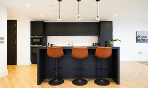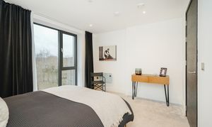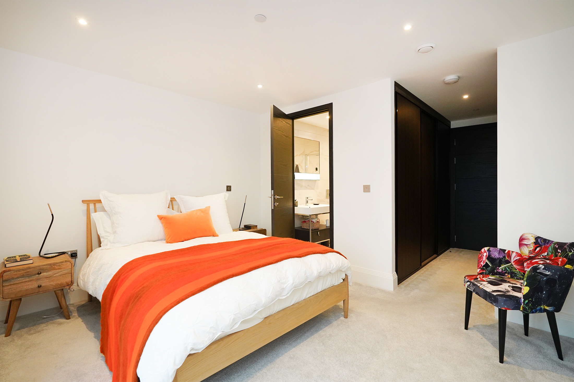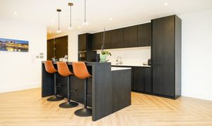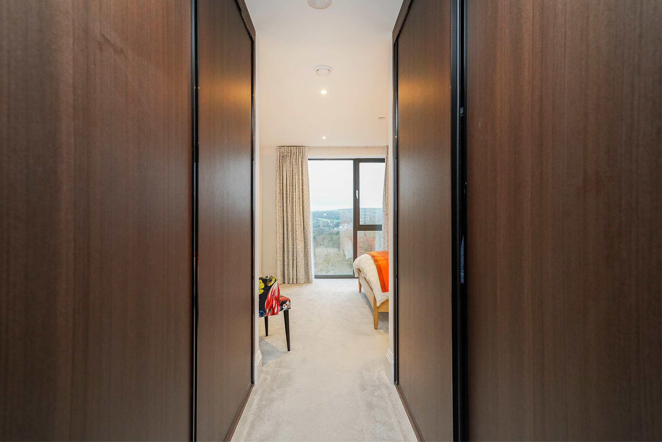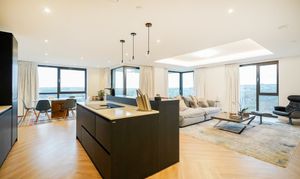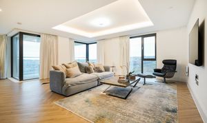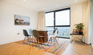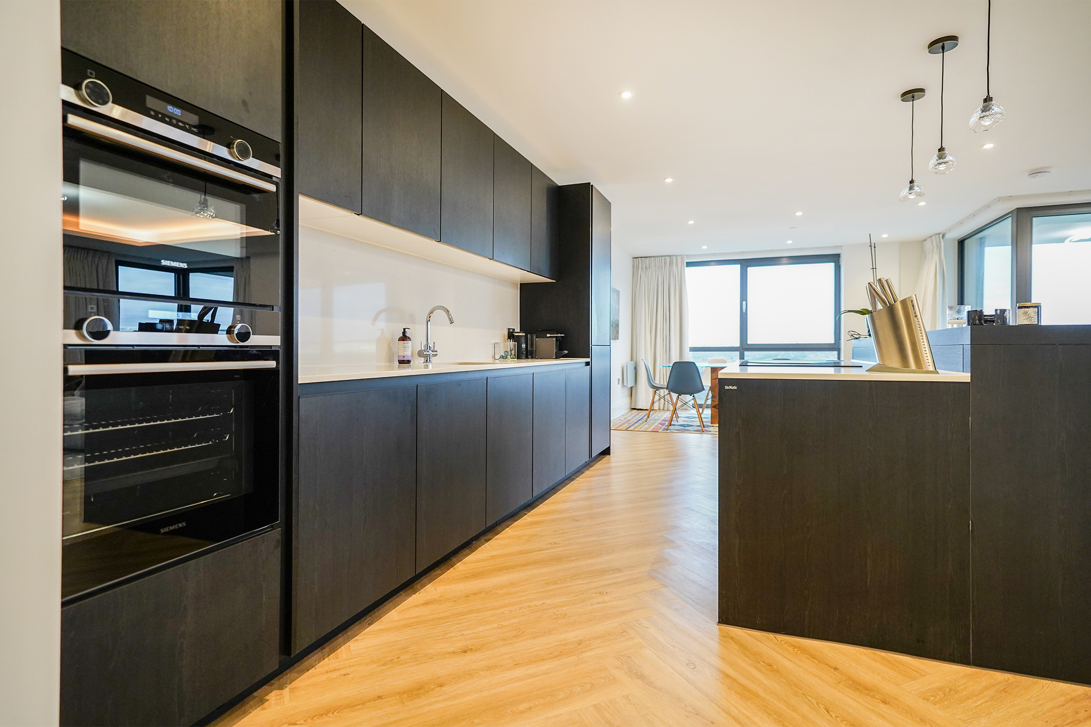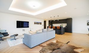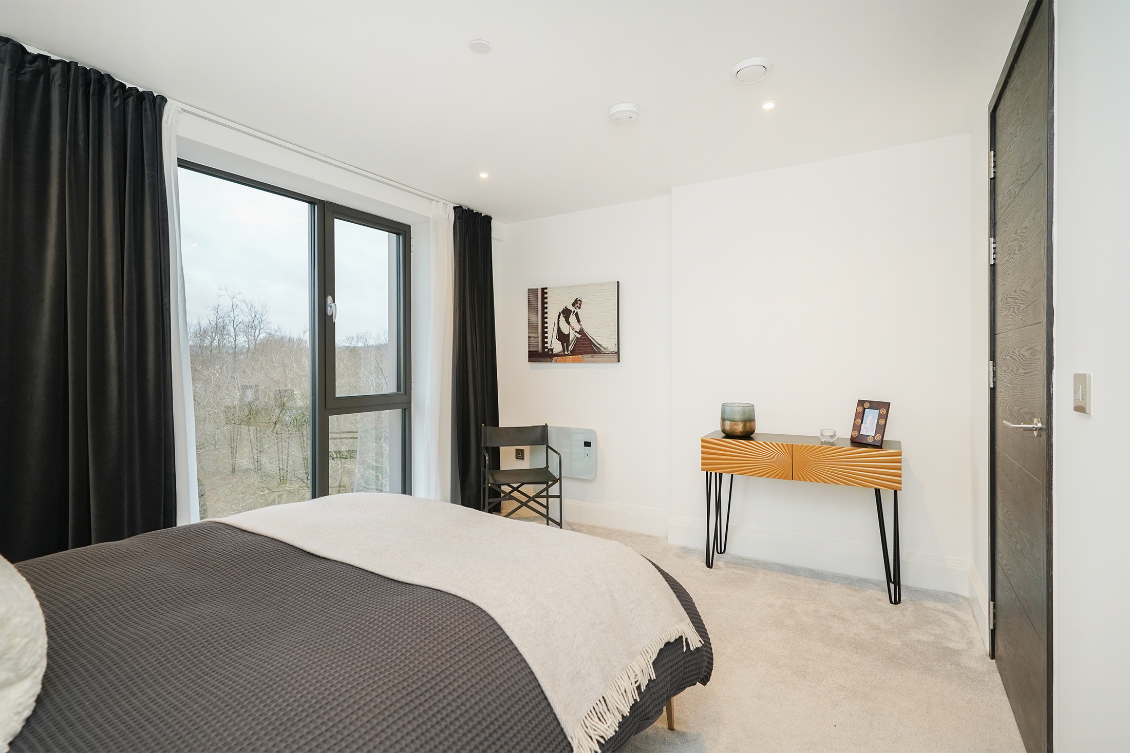 The open-plan living space benefits from floor-to-ceiling windows, allowing natural light to pour in, together with Herringbone flooring. This space incorporates a SieMatic kitchen with quartz worktops, integrated Siemens appliances, and a feature island unit, making it an ideal space for entertaining. The principal bedroom includes a dressing area with built-in wardrobes and a luxury en-suite shower room. The second bedroom is also equipped with fitted wardrobes and is served by a fully tiled main bathroom with a modern large shower cubicle, bath, and vanity unit. You also have additional storage along the hallway with three generous fitted storage cupboards.