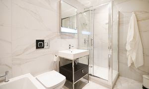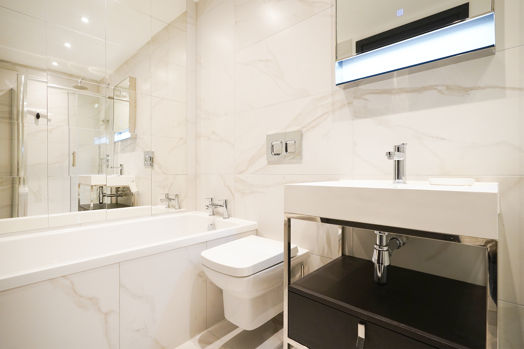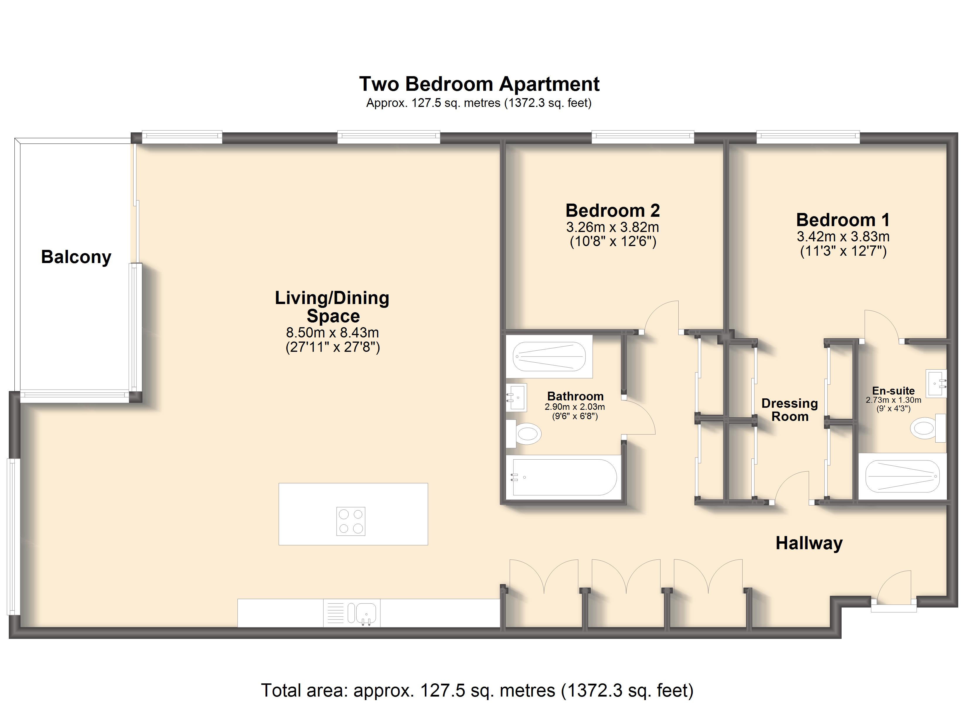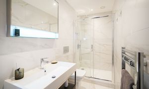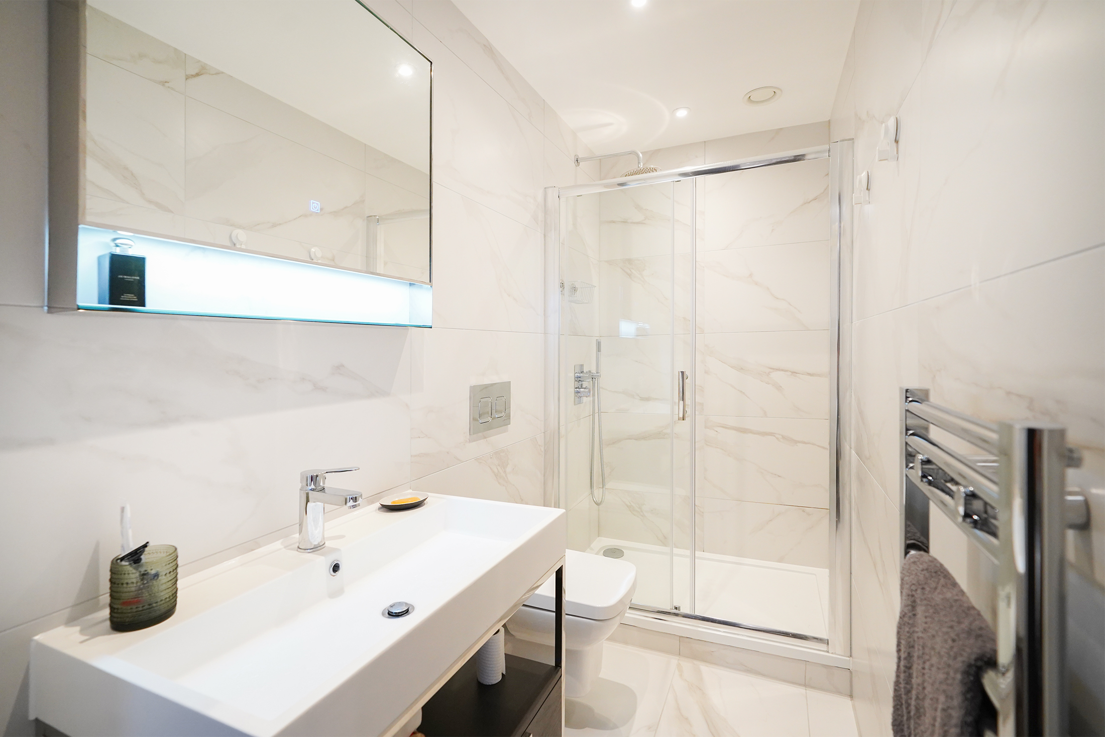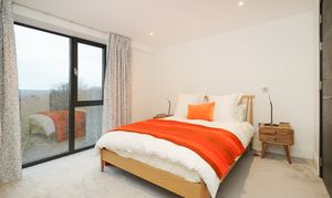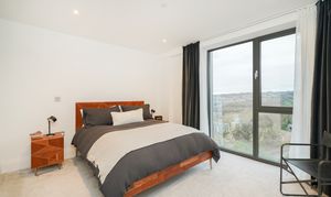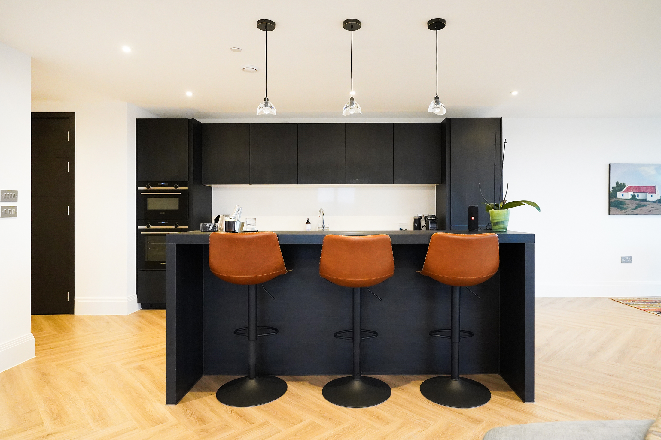 The open-plan living space benefits from floor-to-ceiling windows, allowing natural light to pour in, together with Herringbone flooring. This space incorporates a SieMatic kitchen with quartz worktops, integrated Siemens appliances, and a feature island unit, making it an ideal space for entertaining. The principal bedroom includes a dressing area with built-in wardrobes and a luxury en-suite shower room. The second bedroom is also equipped with fitted wardrobes and is served by a fully tiled main bathroom with a modern large shower cubicle, bath, and vanity unit. You also have additional storage along the hallway with three generous fitted storage cupboards.