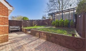 Externally, the front garden benefits from a driveway leading to a garage. The rear garden offers a generous block-paved patio provides an ideal space for seating and entertaining, with steps leading up to a raised lawn bordered by timber sleeper beds. To the rear, a pergola with trellis detailing creates a focal point and a perfect spot for relaxing or outdoor dining. The garden is fully enclosed with fencing, offering a good degree of privacy and a safe environment for families.
