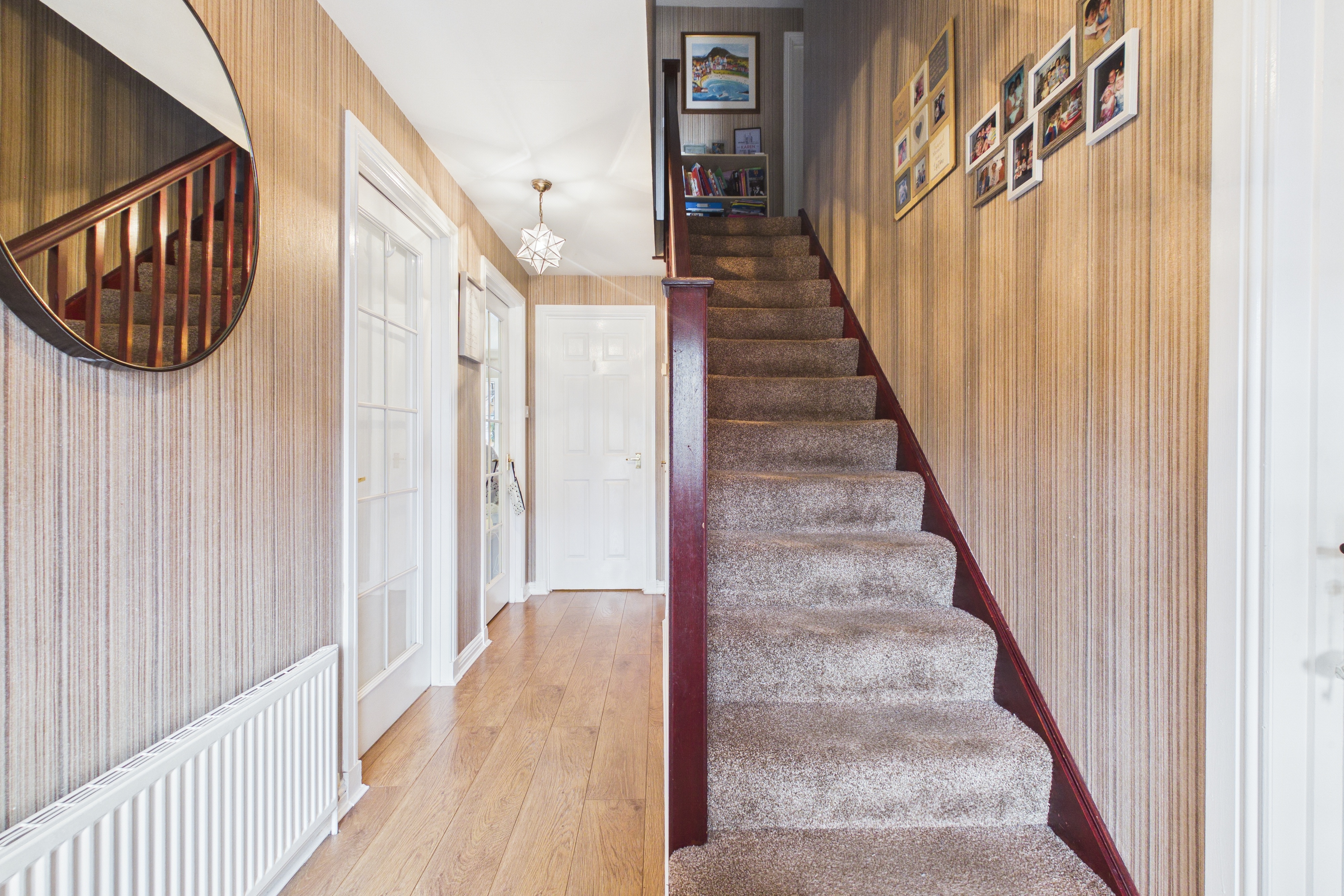 Upstairs, the property continues to impress. The spacious primary bedroom benefits from fitted storage and a well appointed en suite shower room, complete with a walk in shower and vanity storage. Three further well proportioned bedrooms provide excellent accommodation, all served by a modern four piece family bathroom with shower over bath and vanity fittings.