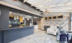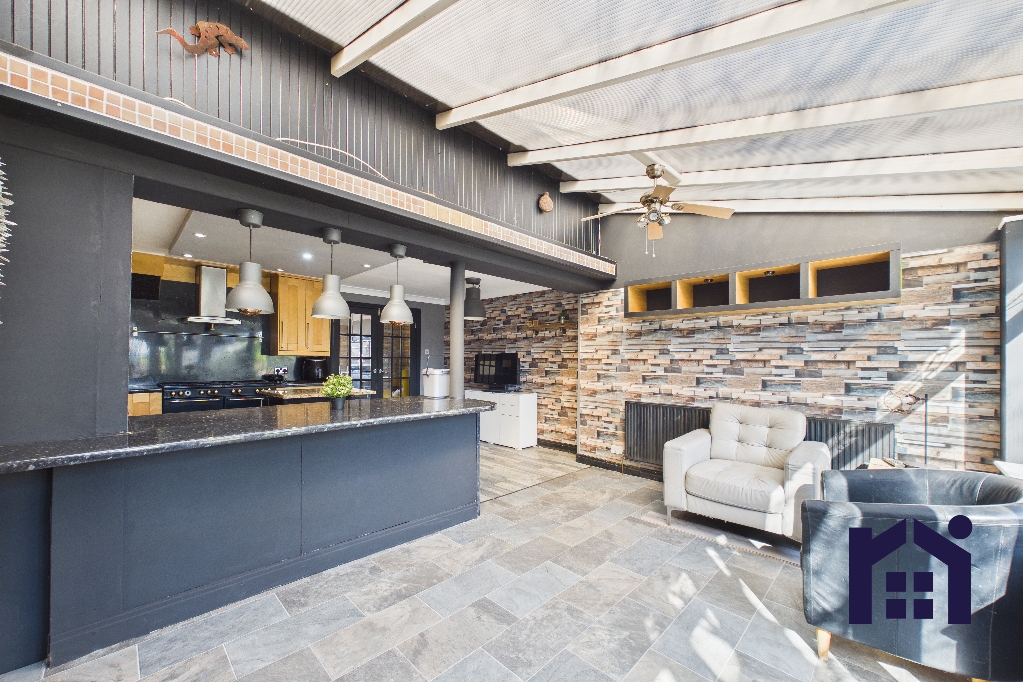 To the front, the driveway with external power supply leads to the main entrance. Step into the hallway and through to the living room, a welcoming space enhanced by panelled walls.