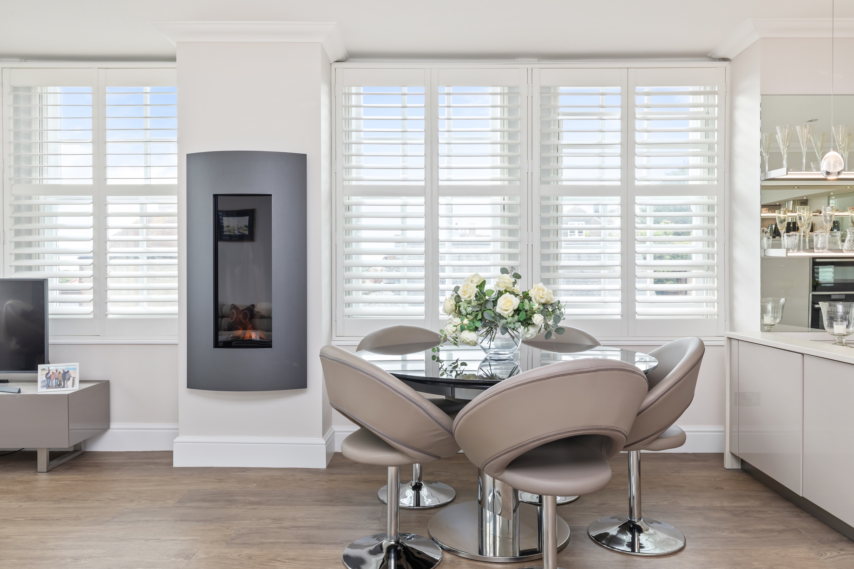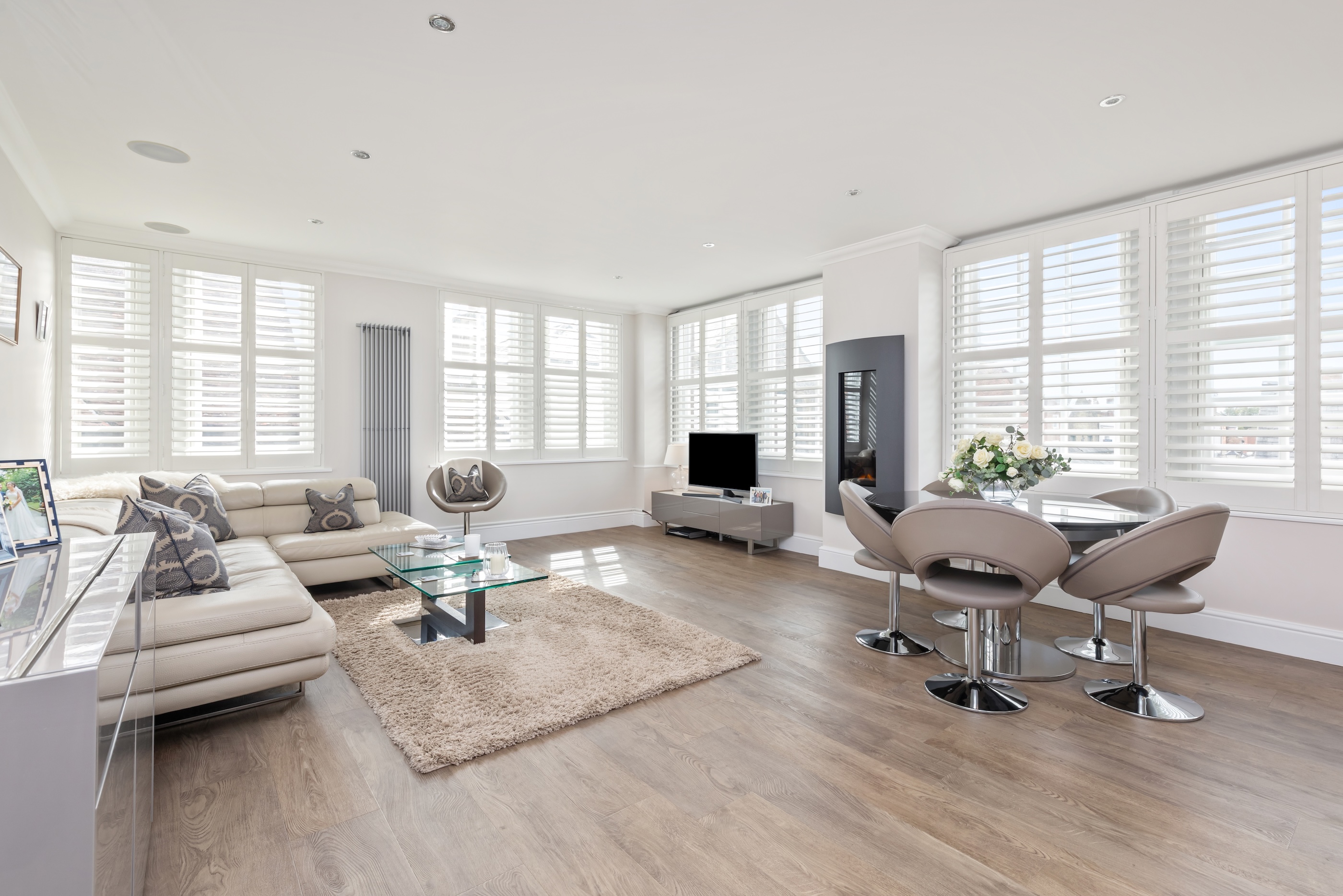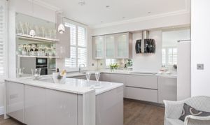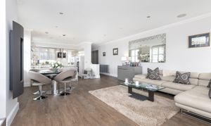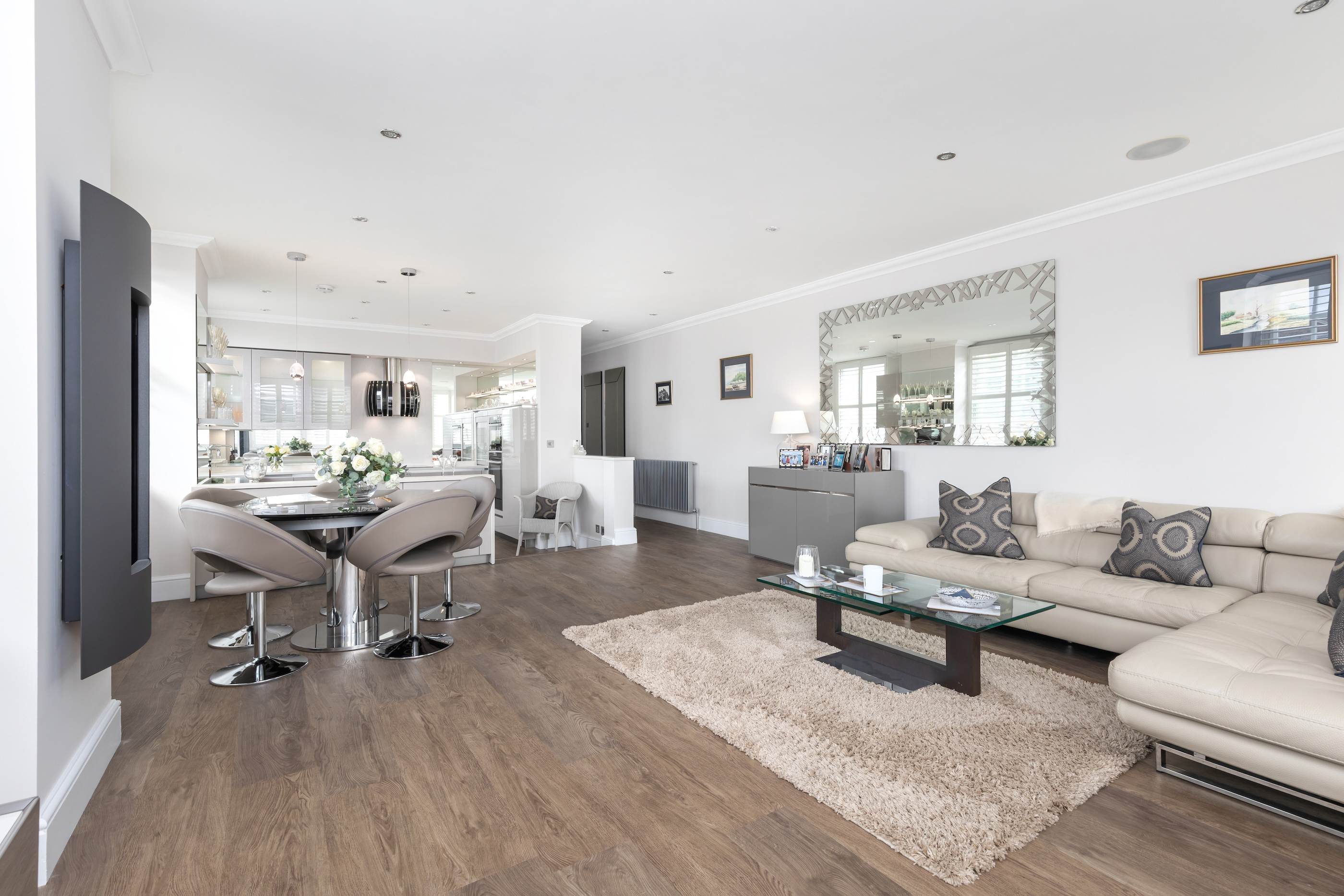 Upon entering, a generous hallway leads to all principal rooms, including the outstanding dual-aspect open-plan living space, ideal for entertaining. The stylish kitchen features bespoke cabinetry and a full range of high-end integrated appliances, seamlessly complementing this elegant area. The living and dining room provides a fantastic setting for hosting guests, with a feature fireplace creating a welcoming focal point.