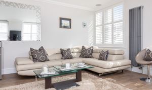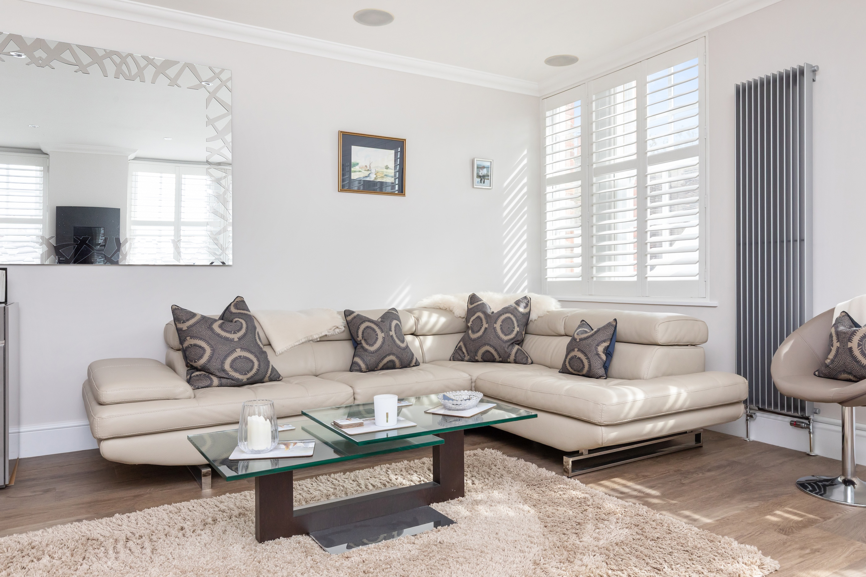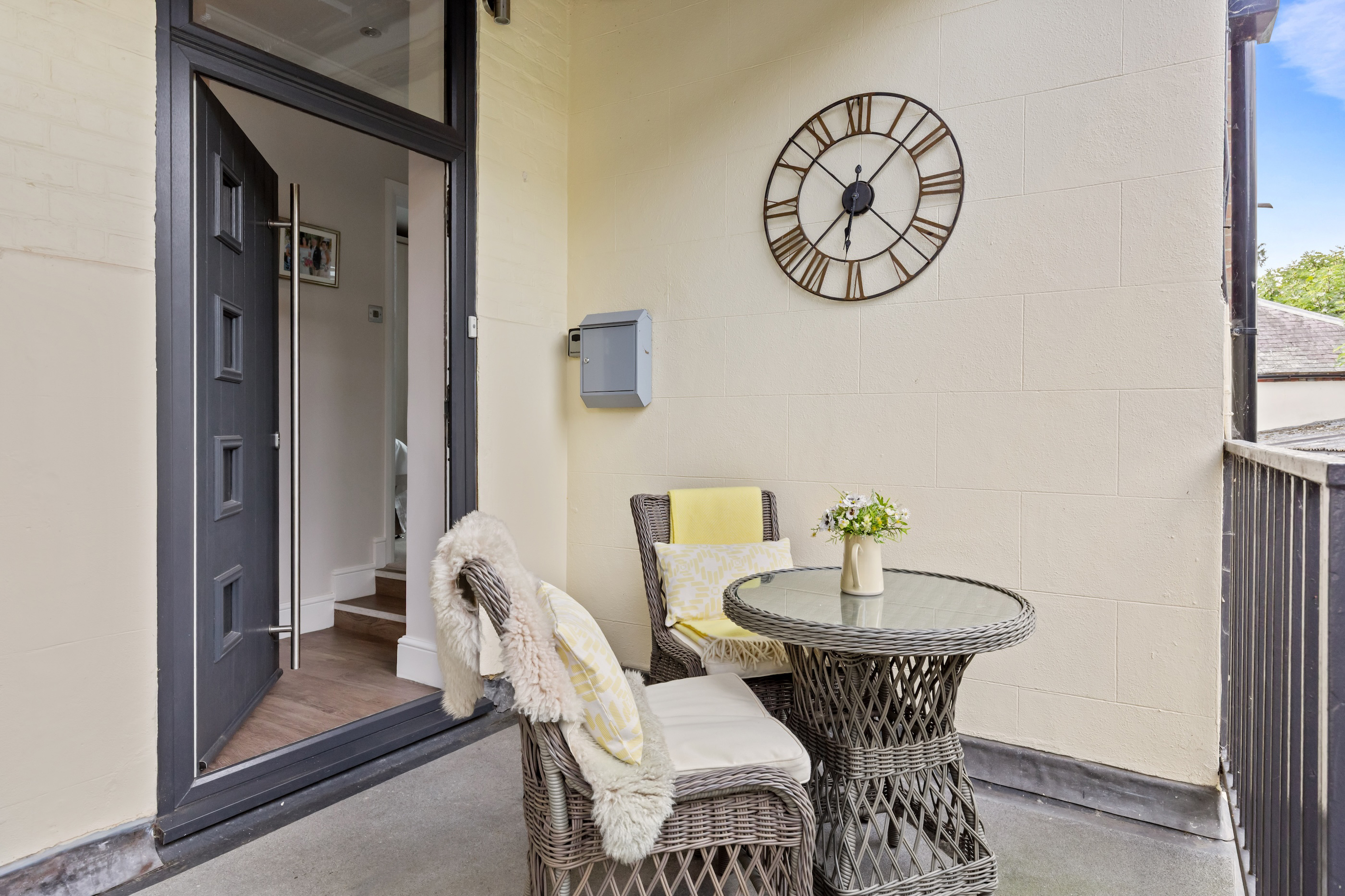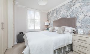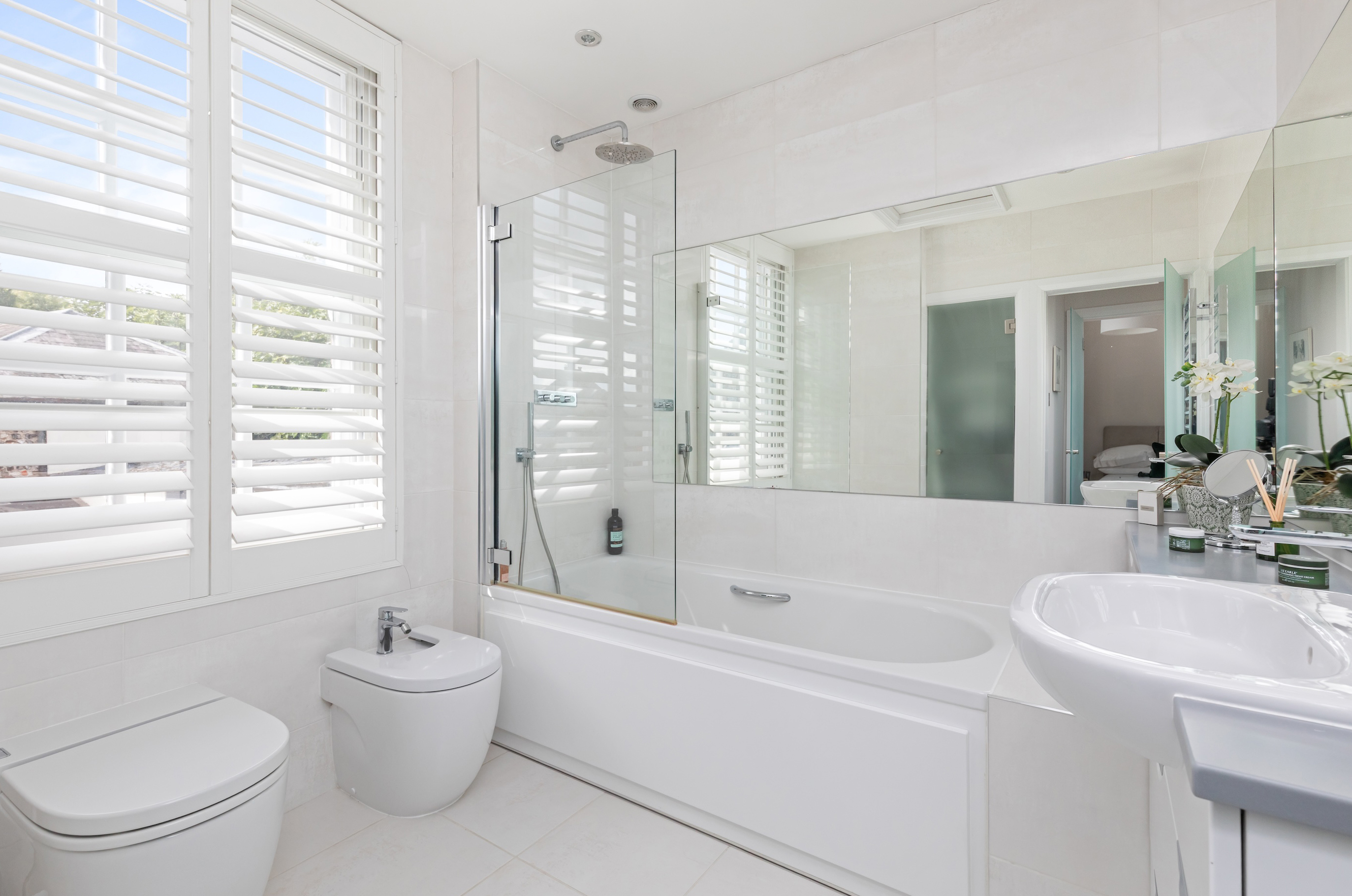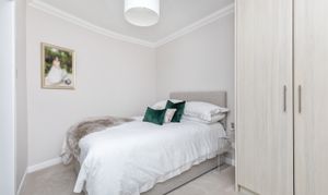Both bedrooms are generously proportioned, fitted with bespoke wardrobes, and enjoy charming views across the town. The main bathroom exudes sophistication, complete with wall-to-wall mirrors and luxurious fittings.