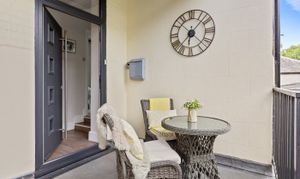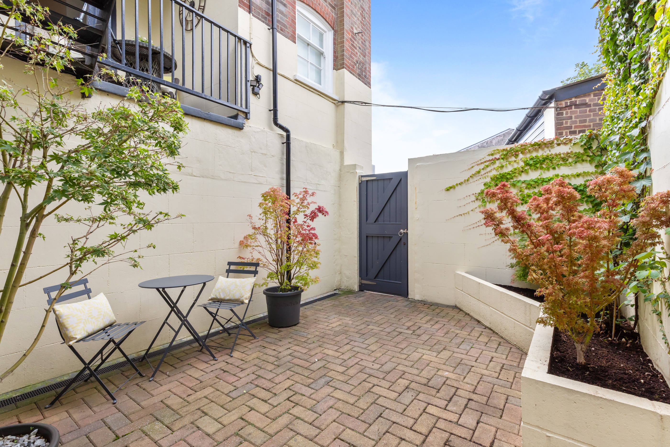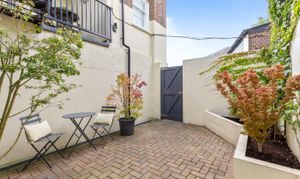 Outside, a private terrace offers the perfect spot for morning coffee, while the communal courtyard provides an inviting space for al fresco dining. The property further benefits from a private parking space and garage with additional storage above, an exceptional and rare find in this historic setting.