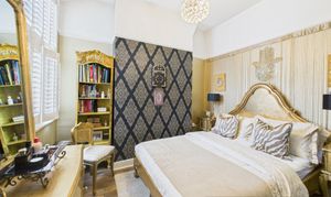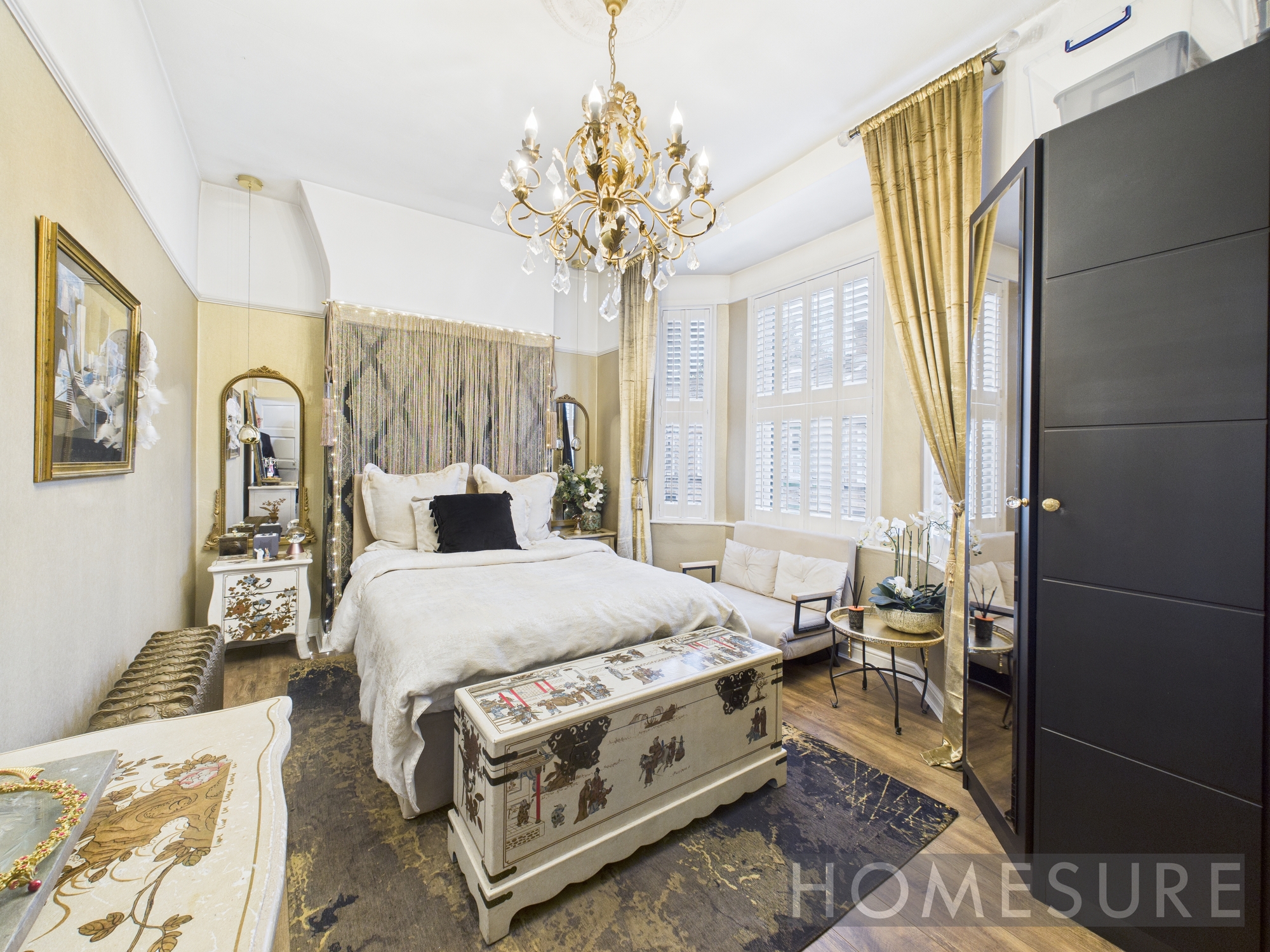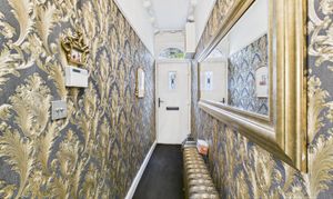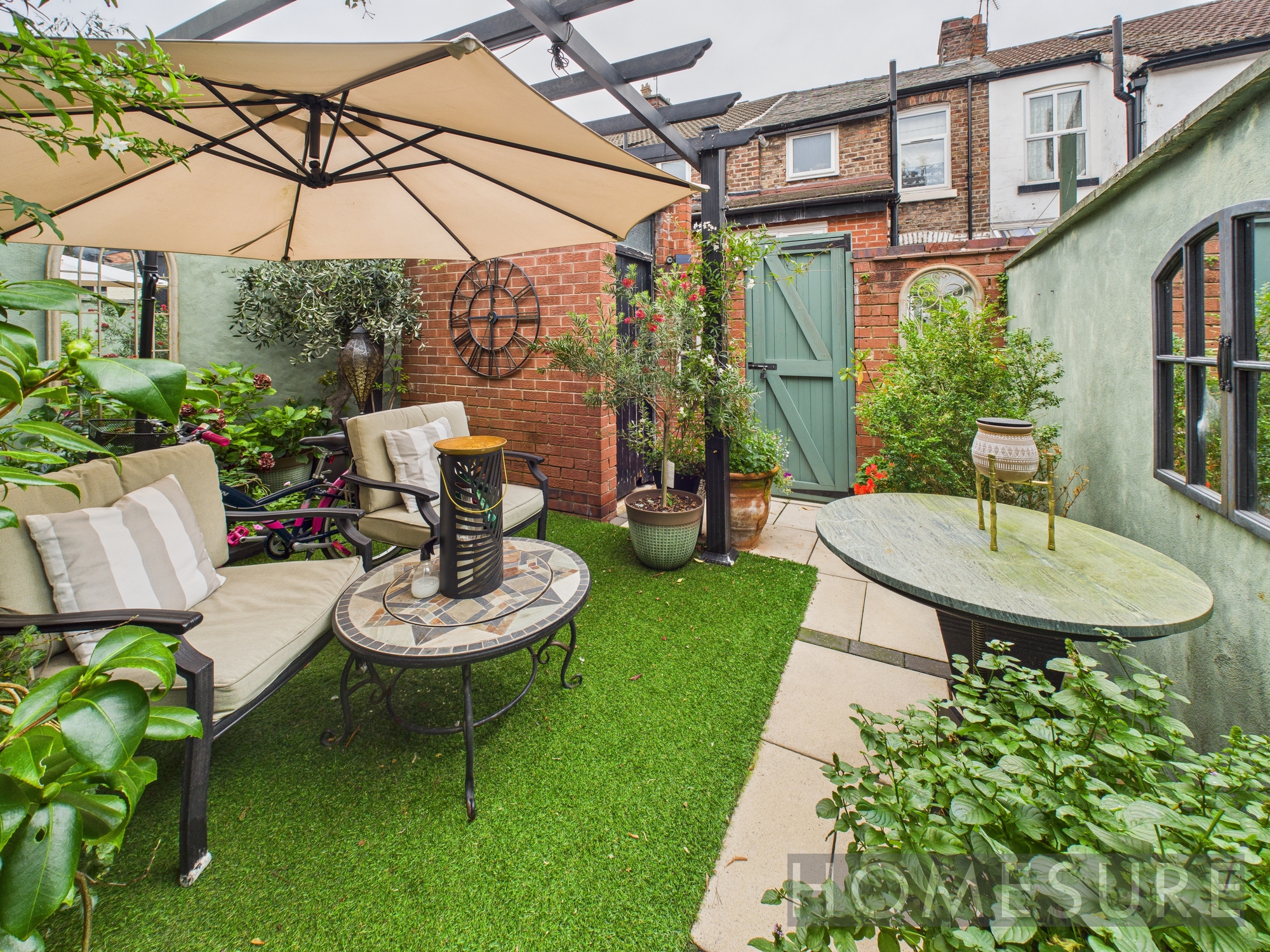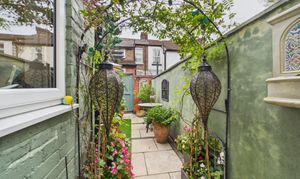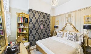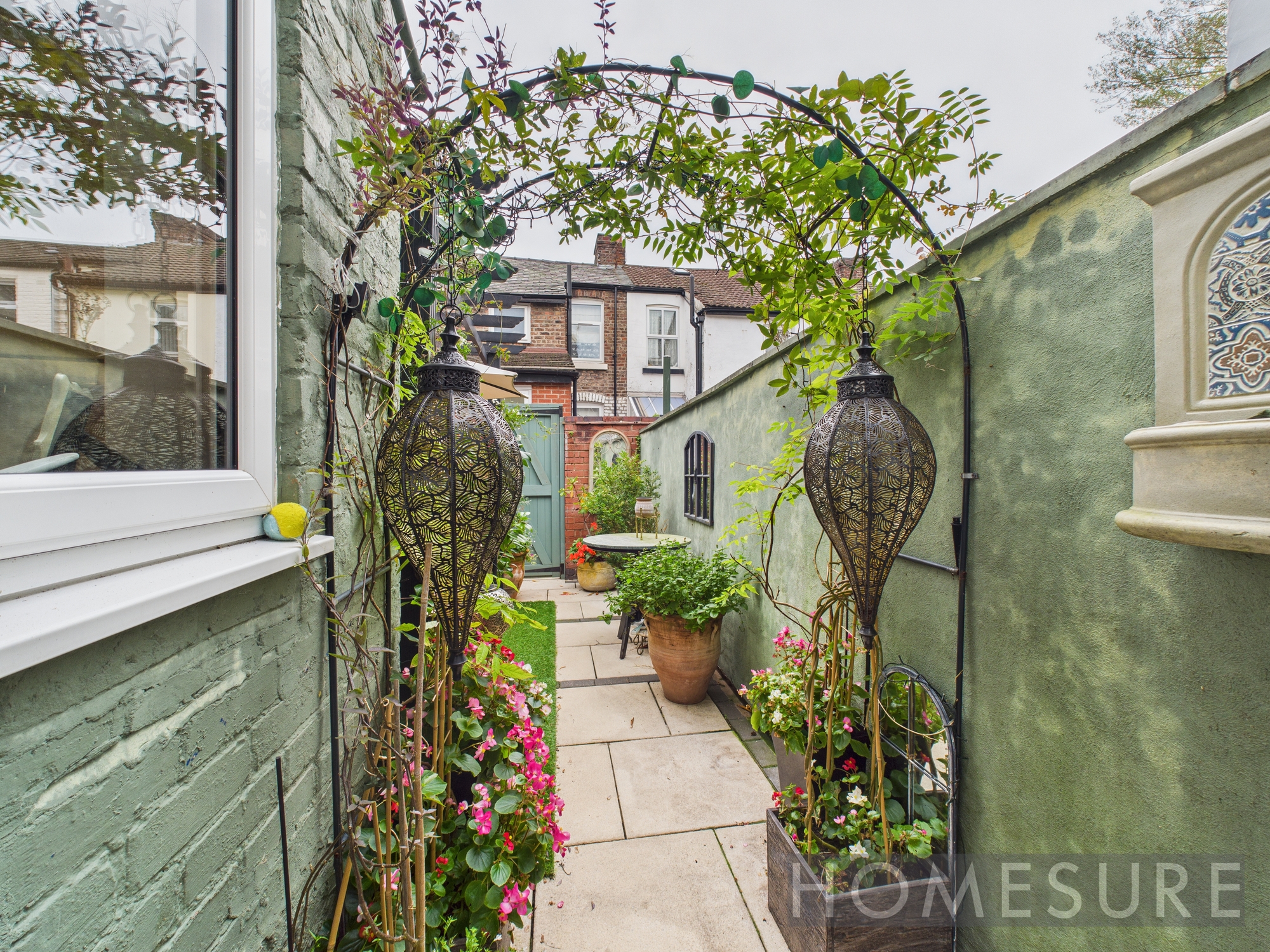 The bedrooms are elegantly appointed, showcasing ornate furnishings, decorative wallpaper, and wooden flooring, with large windows that fill each room with light. The modern bathroom offers a luxurious retreat, boasting a freestanding bath, walk-in shower with mosaic tiling, and elegant fixtures. Outdoors, a charming front space with lush greenery and comfortable seating adds kerb appeal, while the inviting rear garden features a paved patio, artificial grass, and a stylish pergola for shaded outdoor relaxation. Throughout, high-quality finishes, period features, cast iron radiators throughout and thoughtful design touches ensure this home is both practical and visually stunning - ready to move in and enjoy.