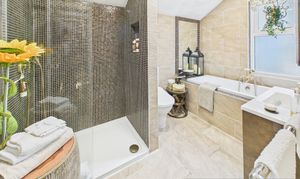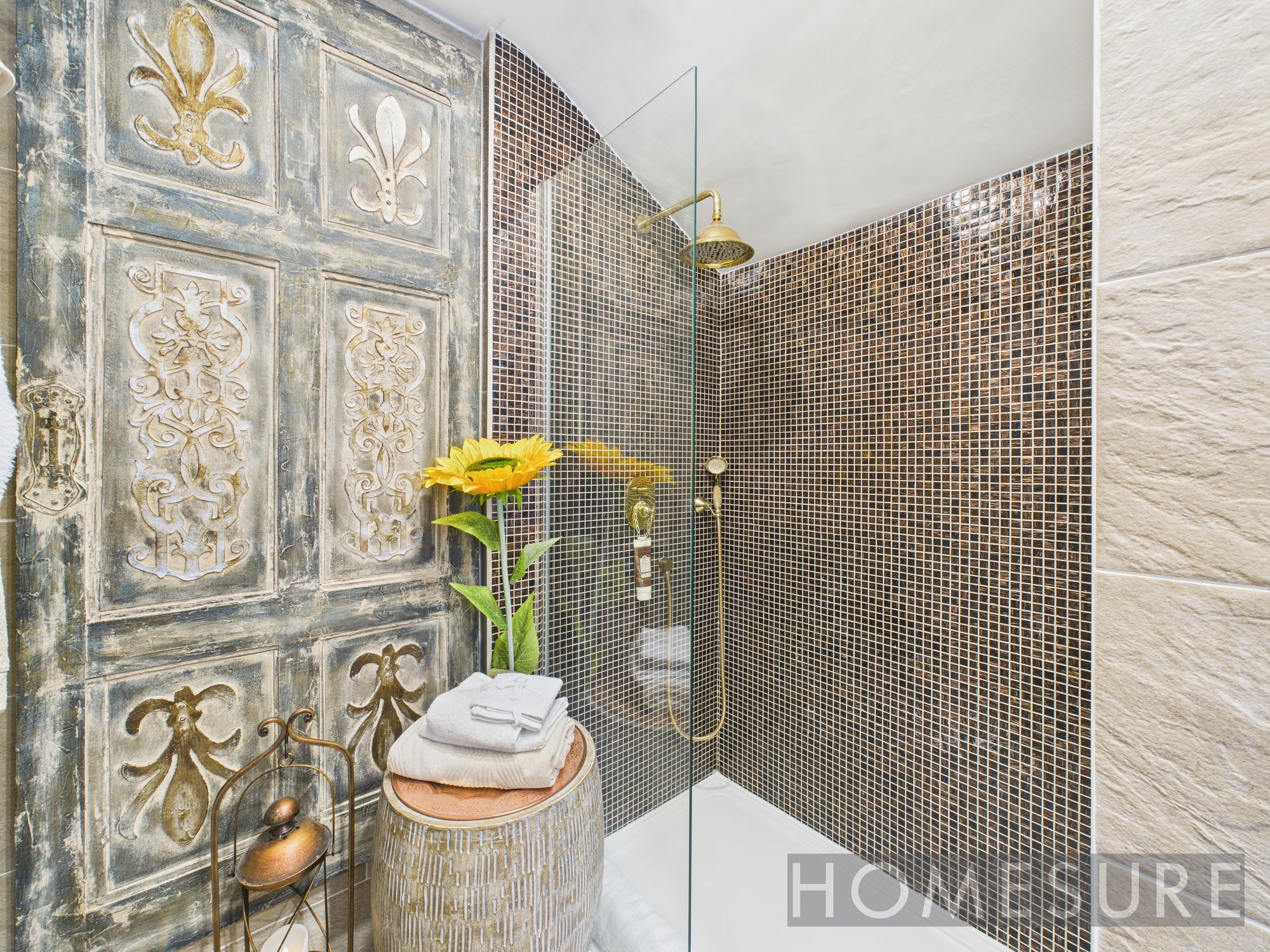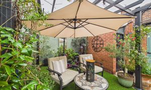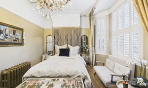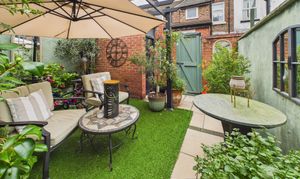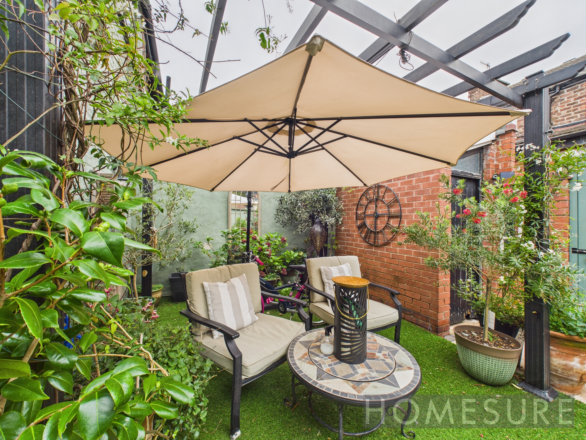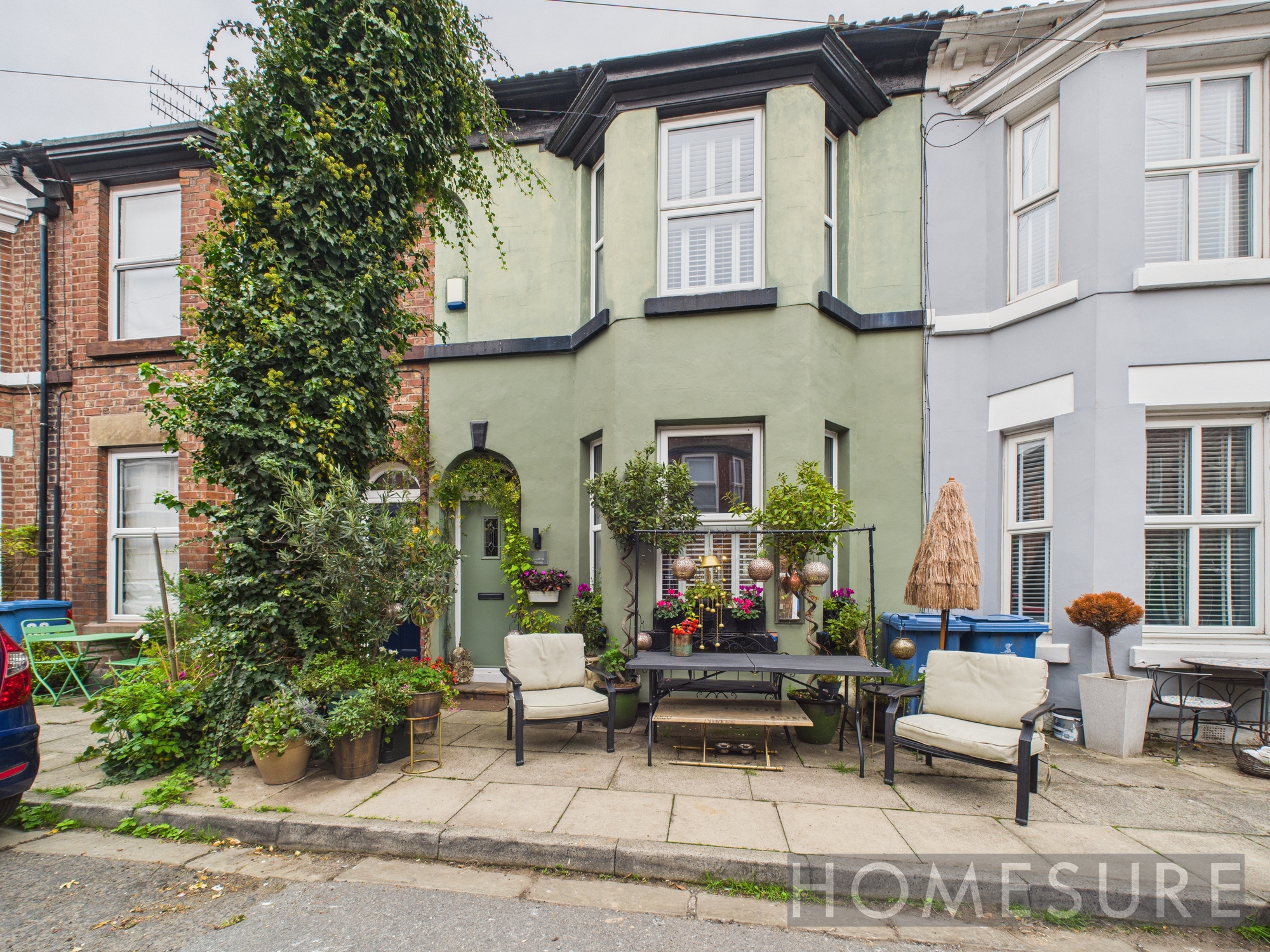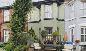 The bedrooms are elegantly appointed, showcasing ornate furnishings, decorative wallpaper, and wooden flooring, with large windows that fill each room with light. The modern bathroom offers a luxurious retreat, boasting a freestanding bath, walk-in shower with mosaic tiling, and elegant fixtures. Outdoors, a charming front space with lush greenery and comfortable seating adds kerb appeal, while the inviting rear garden features a paved patio, artificial grass, and a stylish pergola for shaded outdoor relaxation. Throughout, high-quality finishes, period features, cast iron radiators throughout and thoughtful design touches ensure this home is both practical and visually stunning - ready to move in and enjoy.