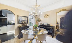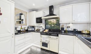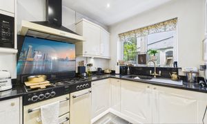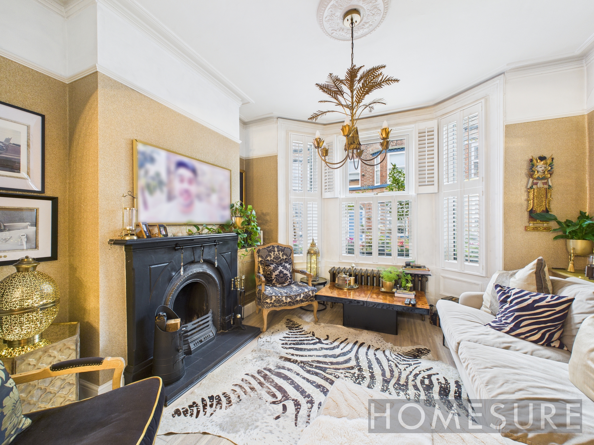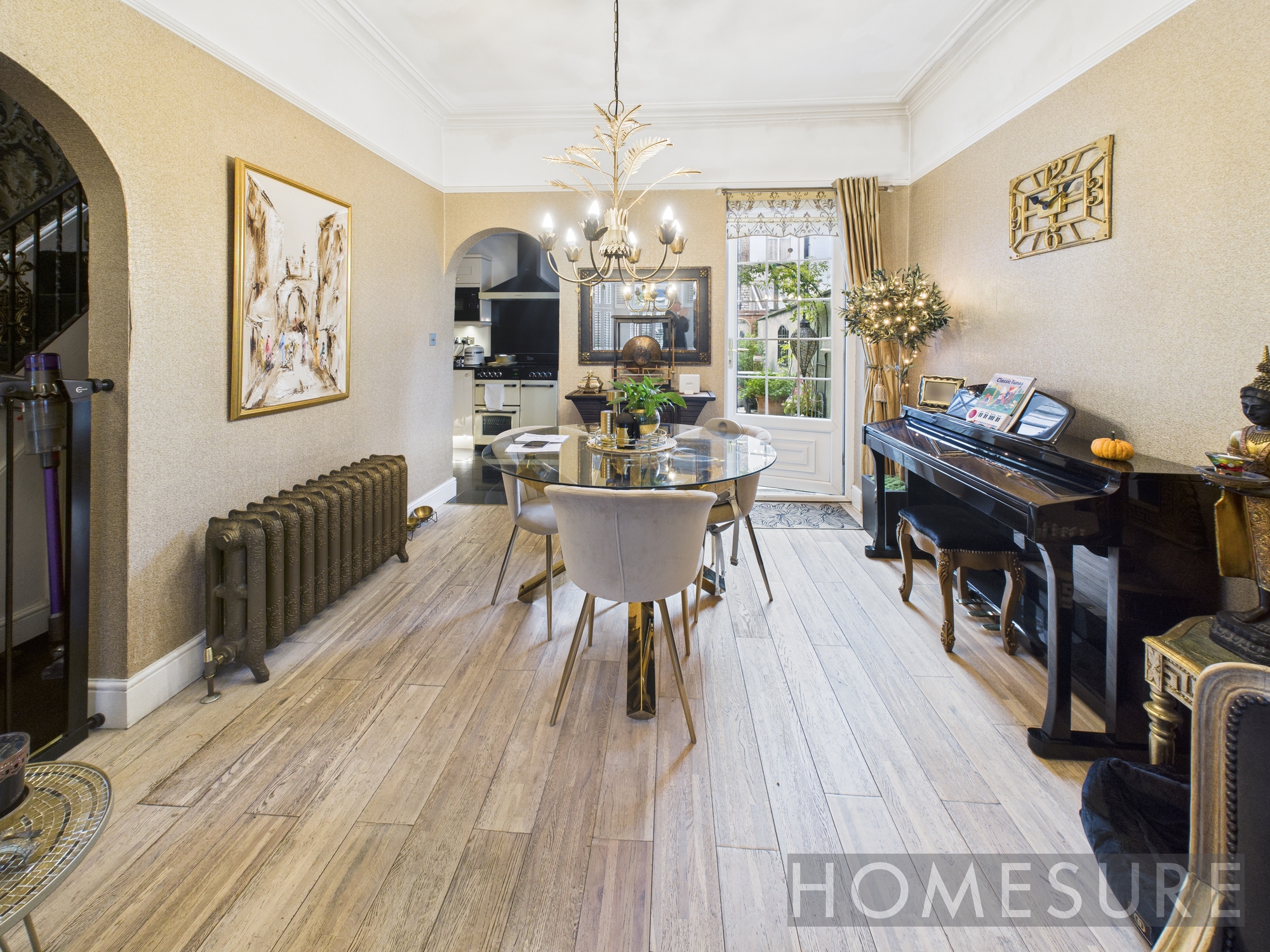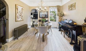 This beautifully presented two-bedroom, one-bathroom mid-terraced house impresses with a harmonious blend of contemporary style and period character. The kitchen-dining area is perfect for entertaining, offering both ample workspace and a stylish setting enhanced by decorative lighting and a sophisticated chandelier. The spacious reception room features a traditional fireplace, high ceilings, and a charming bay window with shutters, creating a bright, welcoming space for relaxing or hosting guests.