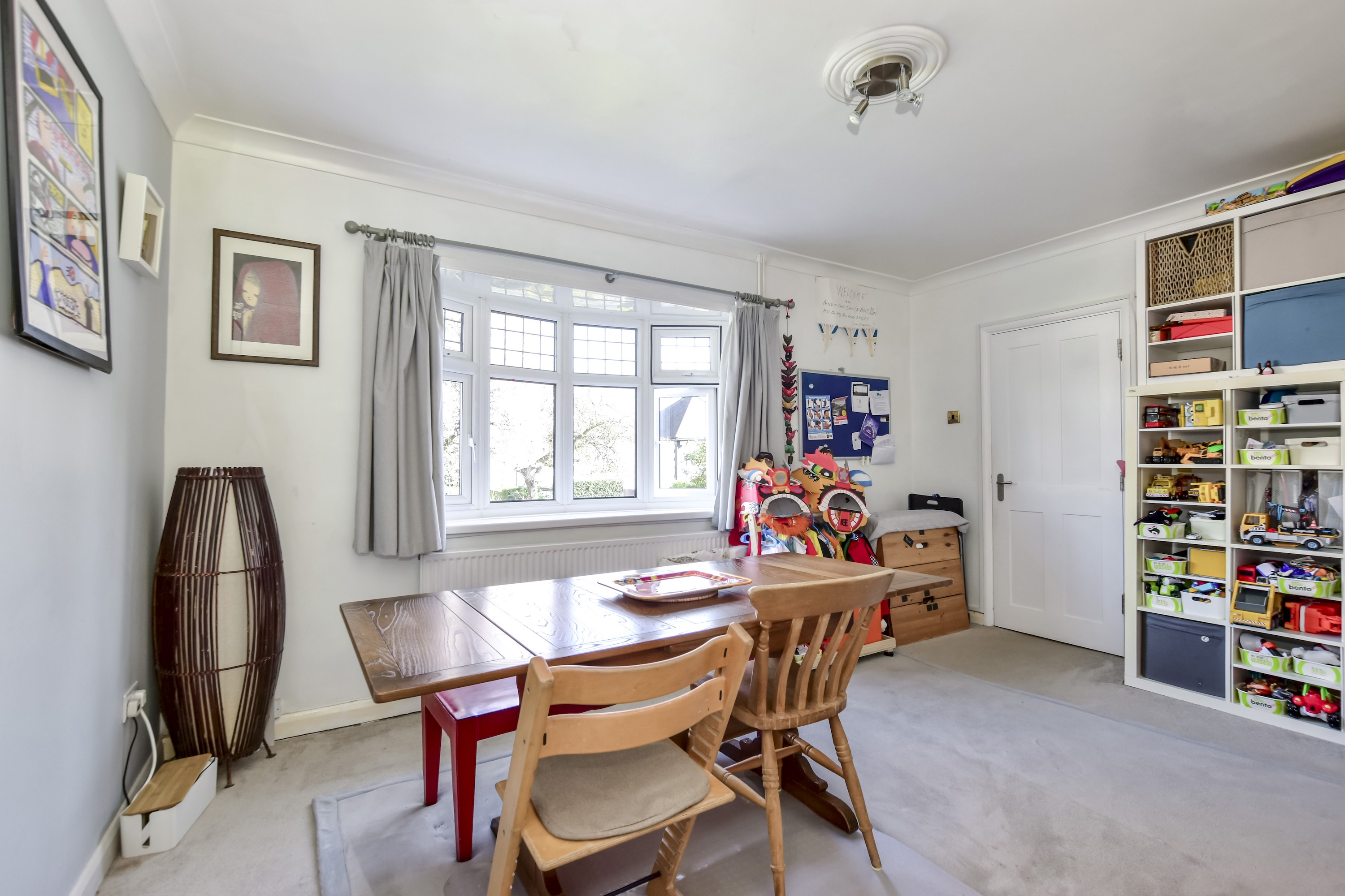 To the rear of the property, the well-appointed kitchen provides ample storage, generous work surfaces and direct access to the dining room. The dining room features a further attractive bay window and offers a superb space for family dining and social gatherings.