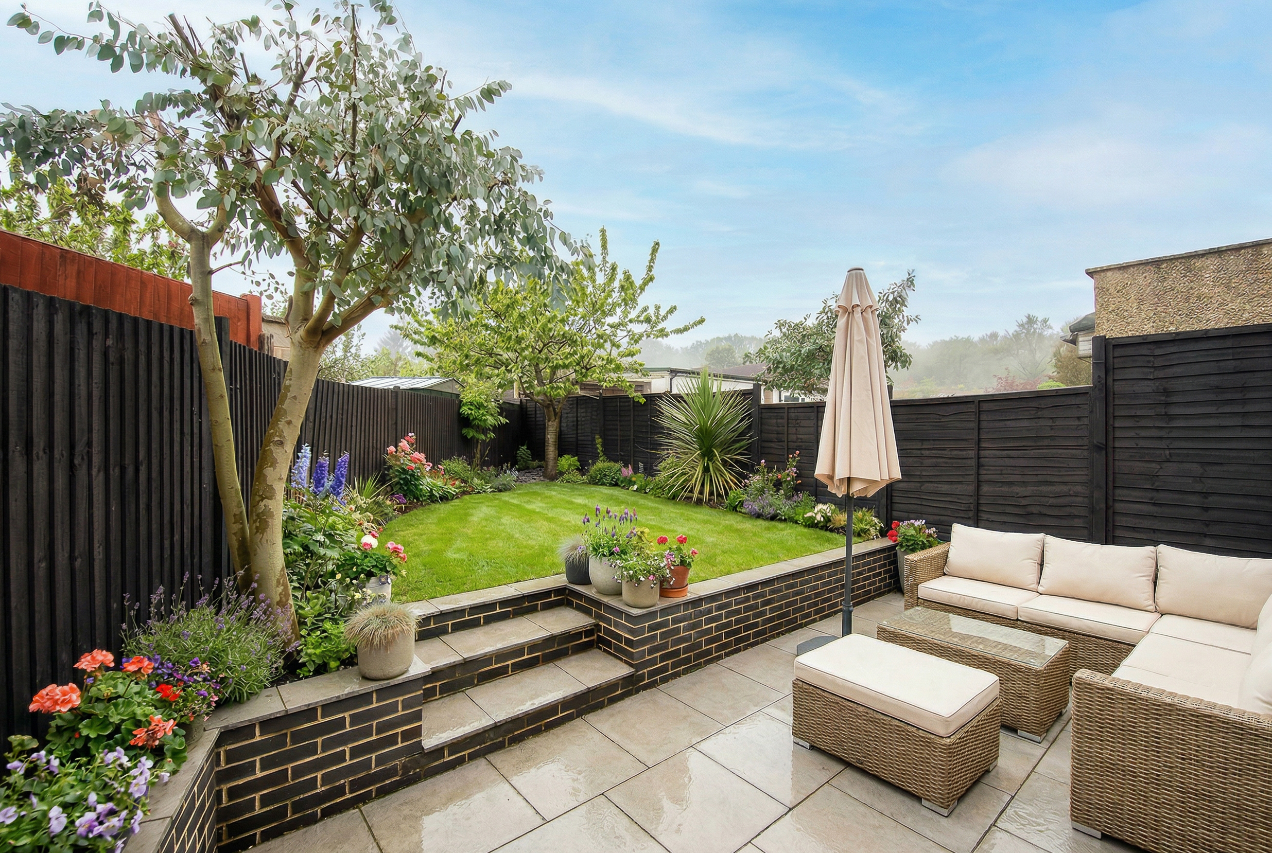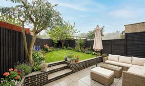 To the rear, a west-facing garden. A spacious patio, thoughtfully levelled to create a seamless flow from the open-plan kitchen, leads via steps to a well-kept lawn with ample room for relaxing, entertaining or outdoor activities. Note: the garden photograph was taken in summer 2025.