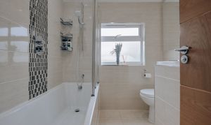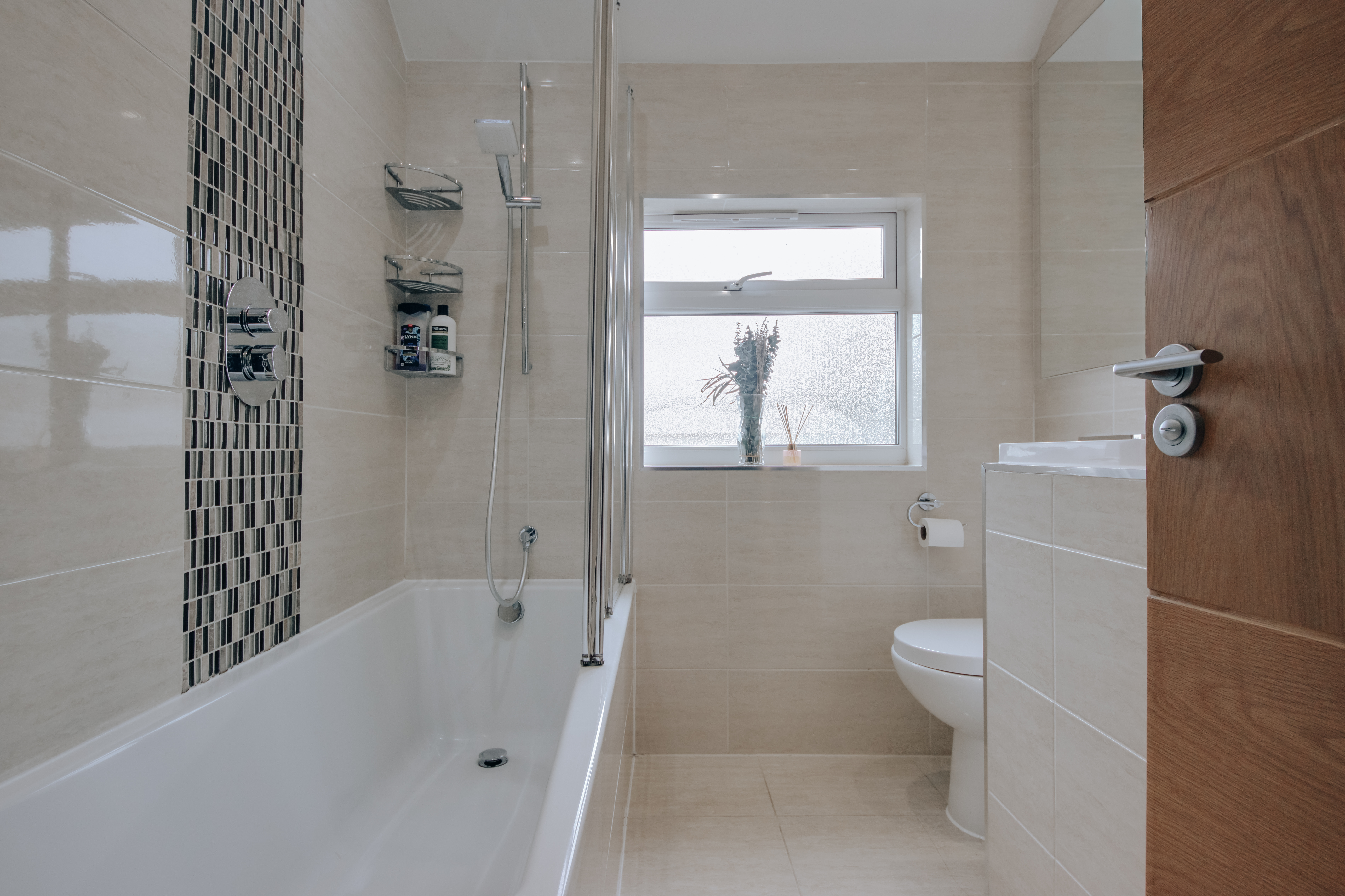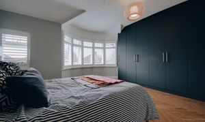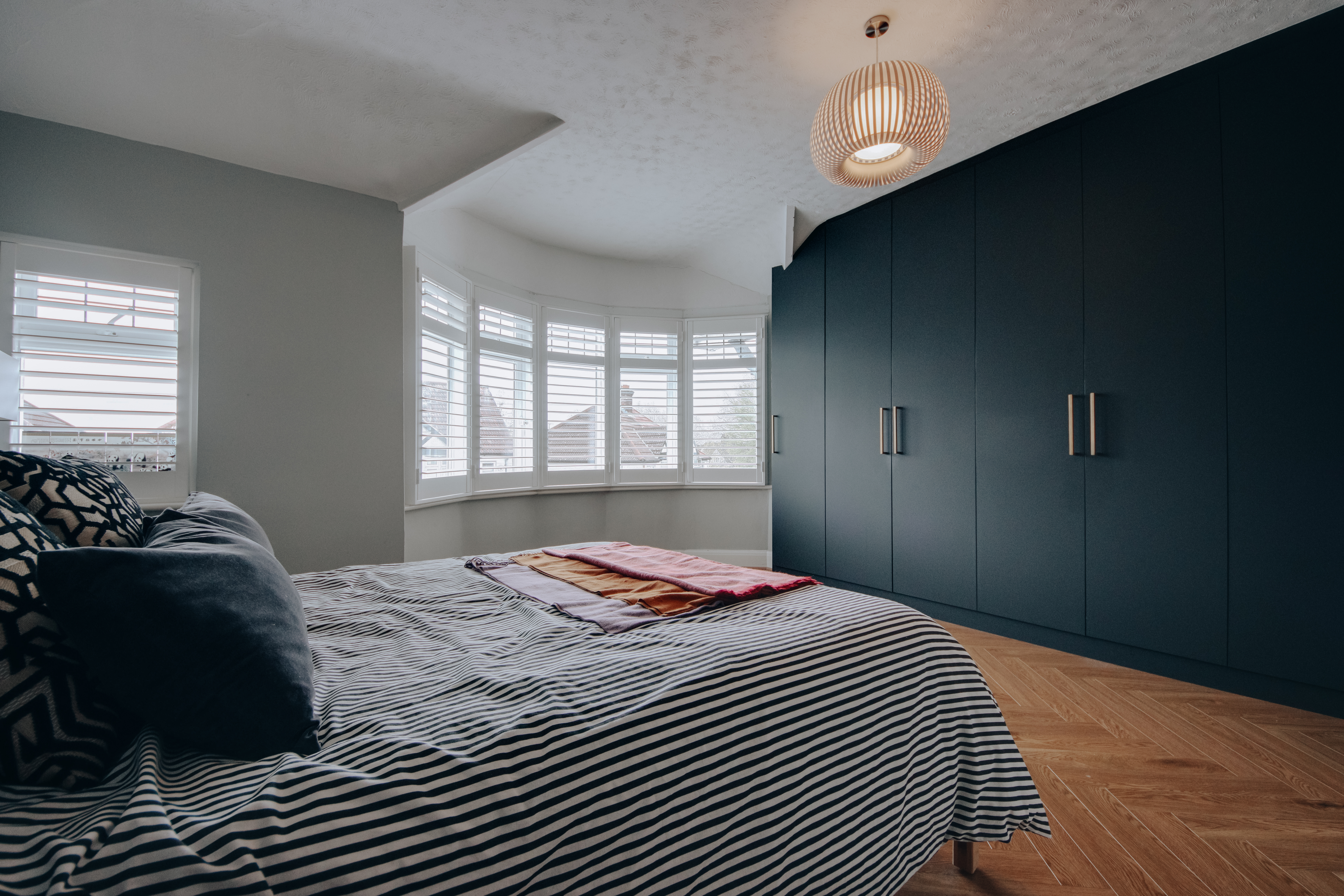 Upstairs, two generously proportioned bedrooms await. The principal bedroom (14'4" x 11'3") largely mirrors the layout of the living room below, with built-in cabinetry running the full width of the rear wall and ample natural light through the easterly-facing bay window. The second bedroom continues the home's design language, currently used as an office but easily adapted to a single bedroom depending on need. A beautifully finished family bathroom completes the floor: bathtub, overhead rainfall shower, and an exceptional level of finish throughout.