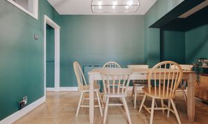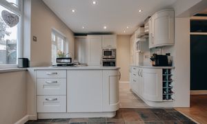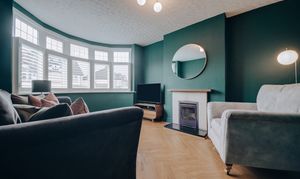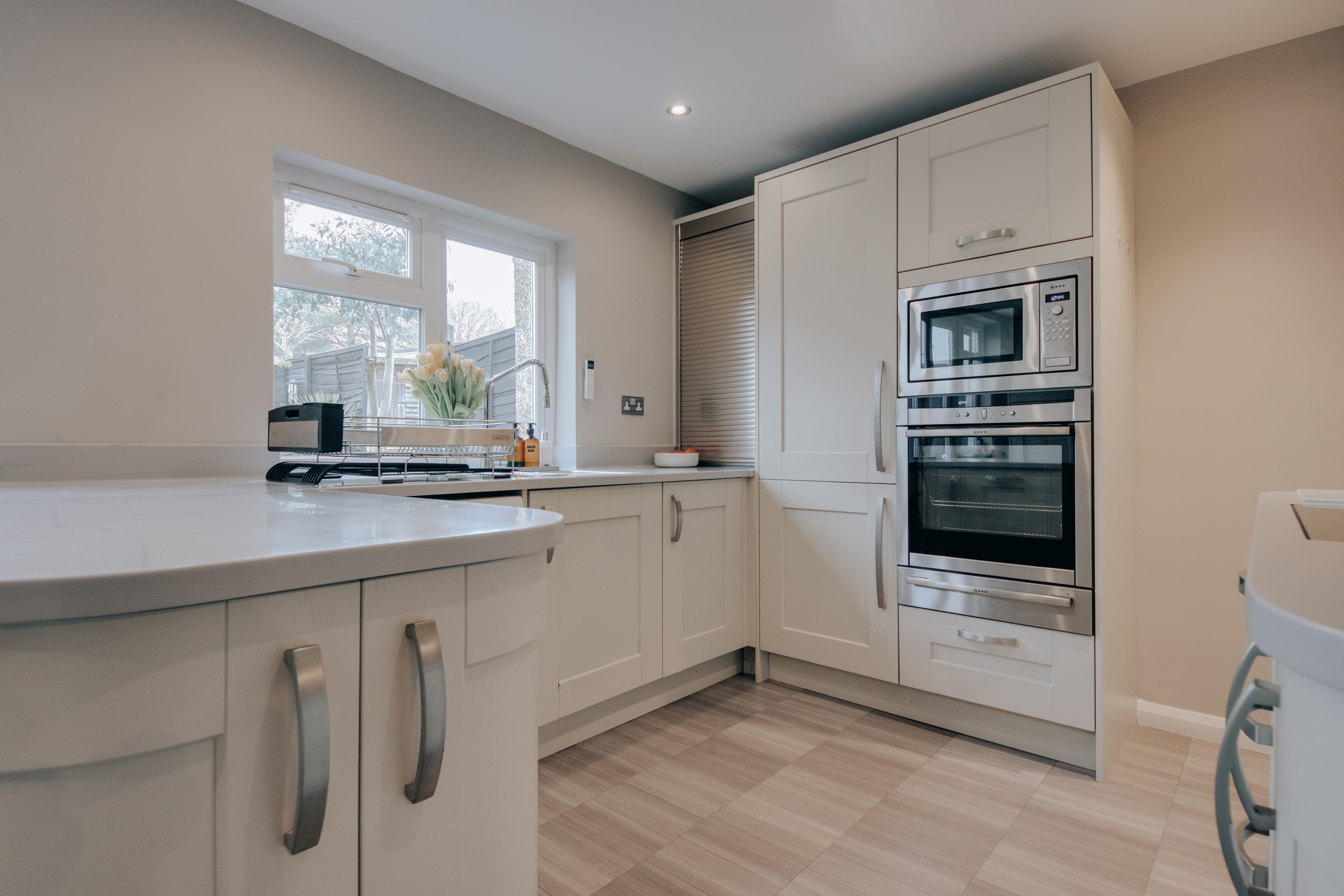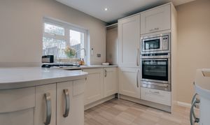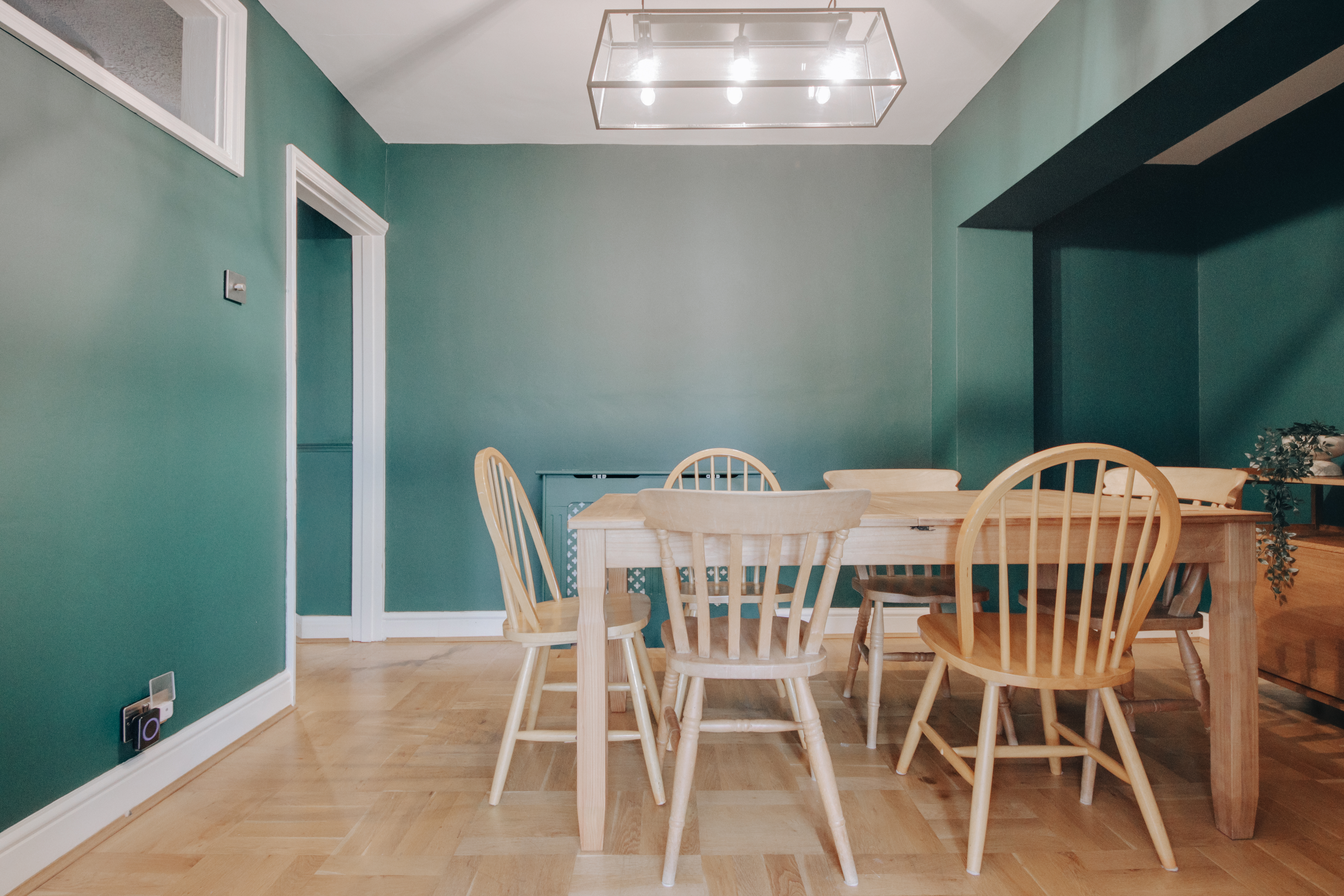 Step inside and a spacious hallway leads to the heart of the home. To the left, the living room (14'4" x 11'3") presents in impeccable condition: colour-drenched in a deep green palette, with herringbone engineered oak flooring, a striking chimney breast and a large bay window that enhances the sense of space. Beyond, a designated dining area sits in stylistic harmony with the living room. A rear nook, the perfect candidate for downlighting, could equally showcase a piece of art or house a wine collection. The kitchen and breakfast room sits at the rear: a showstopper, centred on a breakfast bar and surrounded by a full suite of cabinetry and modern appliances, all arranged with precision. A neutral palette paired with brushed chrome hardware creates an atmosphere of understated elegance.