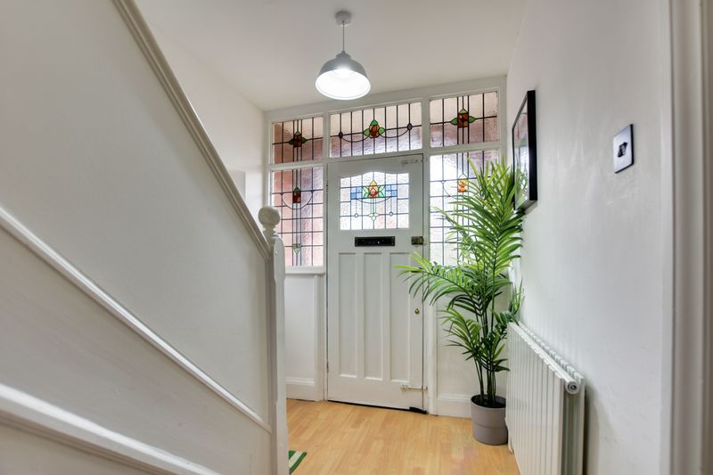 With a part-leaded stained-glass door and window to the front elevation, stairs to the first floor, laminate flooring, and a radiator.