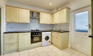 With a double glazed window to rear and side elevations, stainless steel sink and drainer, wall and base units with work surfaces, built-in oven and gas hob with stainless steel chimney hood, plumbing for washing machine, breakfast bar, wall-mounted boiler, tiled flooring, and radiator