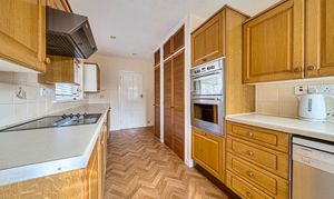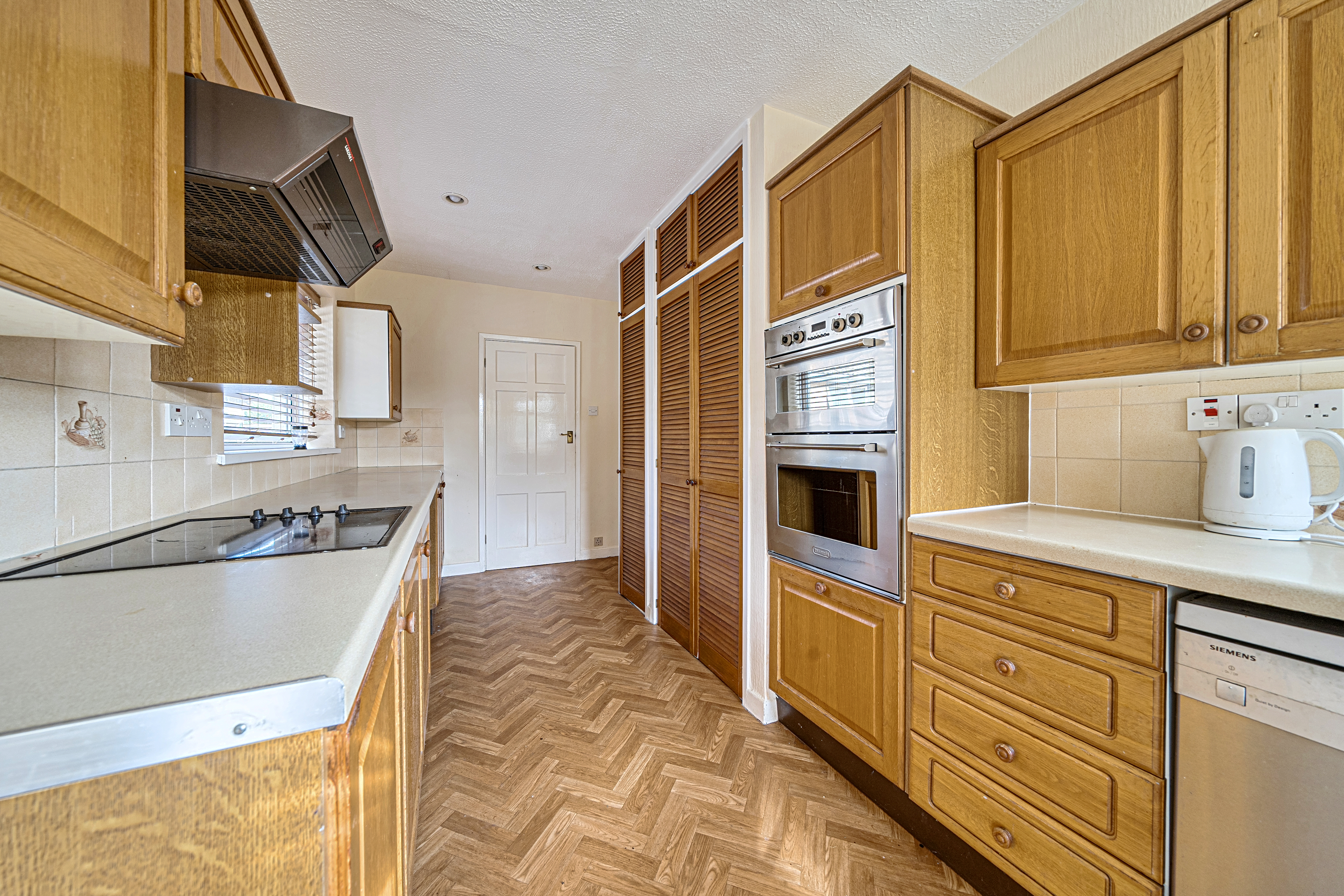 To the right, the kitchen offers a functional space with a double oven, electric hob, and room for a large fridge freezer and washing machine. Windows to the rear and side provide natural light and a view over the garden. From the kitchen, a door leads down a few steps to a small rear lobby with access to a cloakroom (toilet and sink), a side door to the driveway, and a door out to the rear garden.