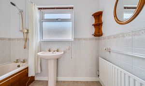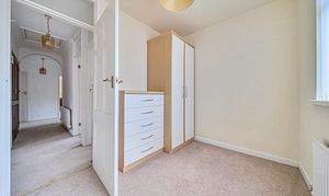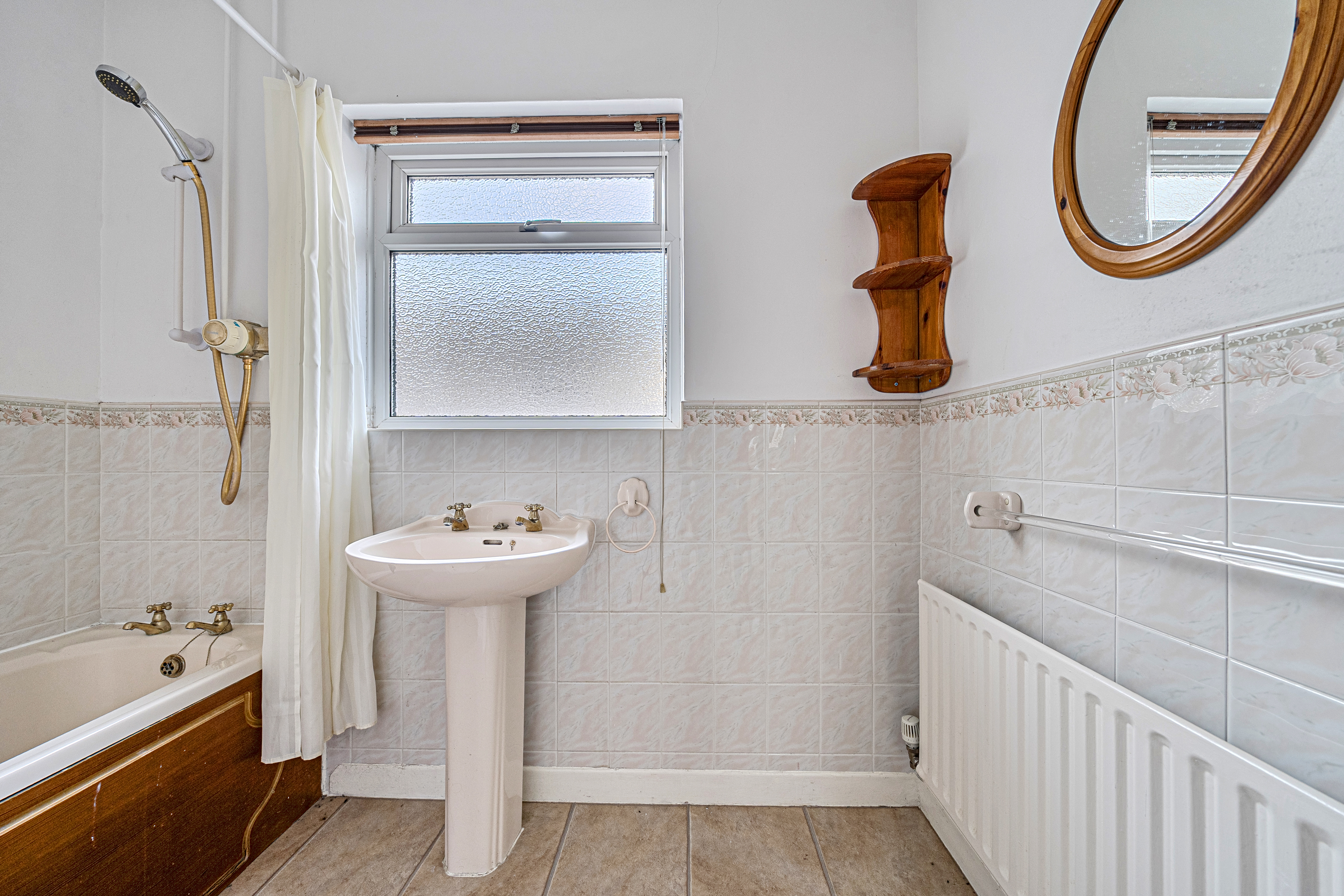 There are two further bedrooms, including a generous principal bedroom with a range of fitted wardrobes and a dressing table. The main bathroom features a bath and sink, with a separate WC located conveniently next door.