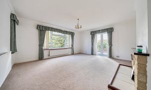 Further along the hallway is the spacious sitting room, where a large window and French doors to the rear garden bring in light from both aspects. A feature fireplace with decorative surround and open fire create a warm and welcoming space.