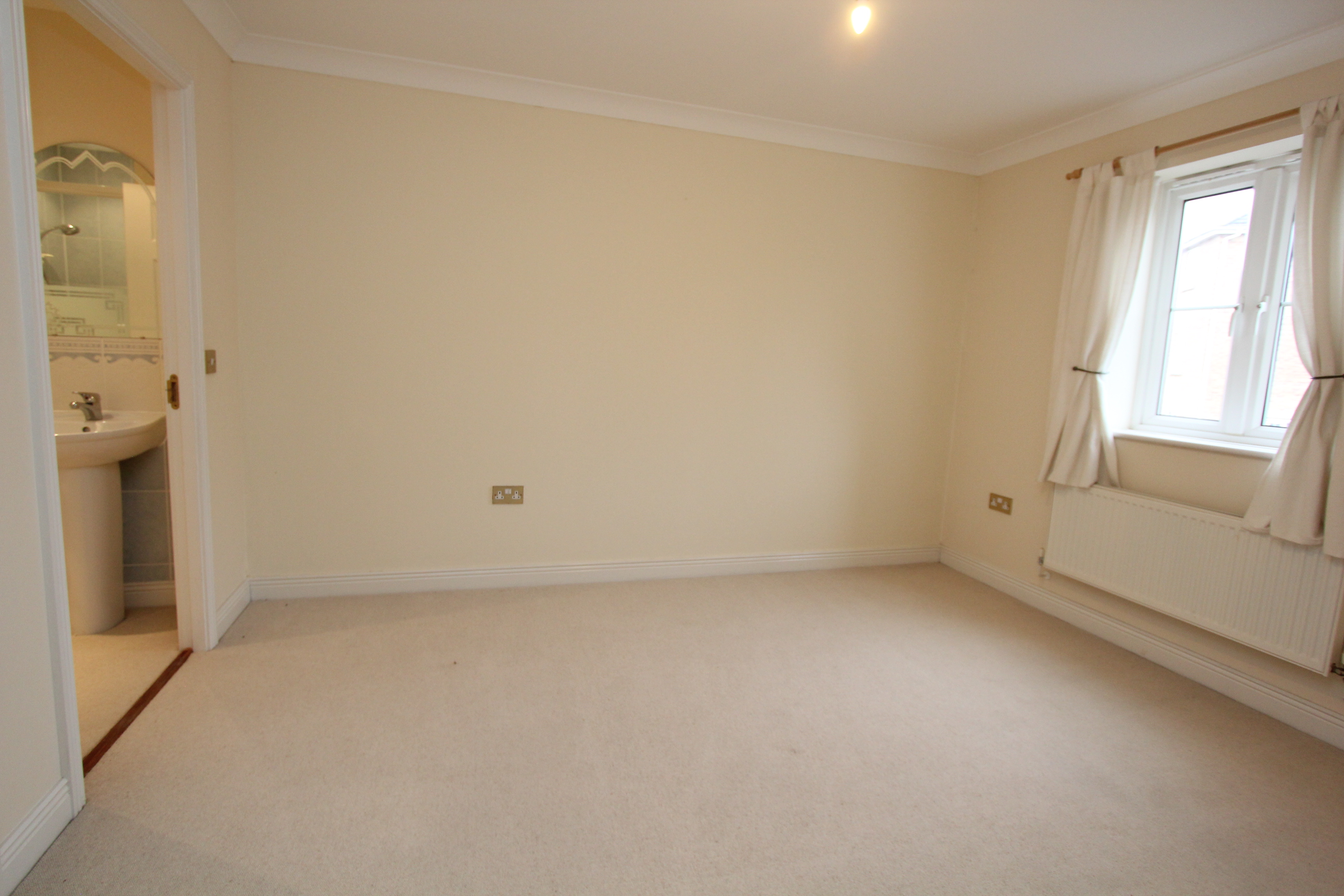A good size carpeted double bedroom with front window, radiator and smooth coved ceiling. There is also a recessed double wardrobe and a panelled door accessing the en suite.