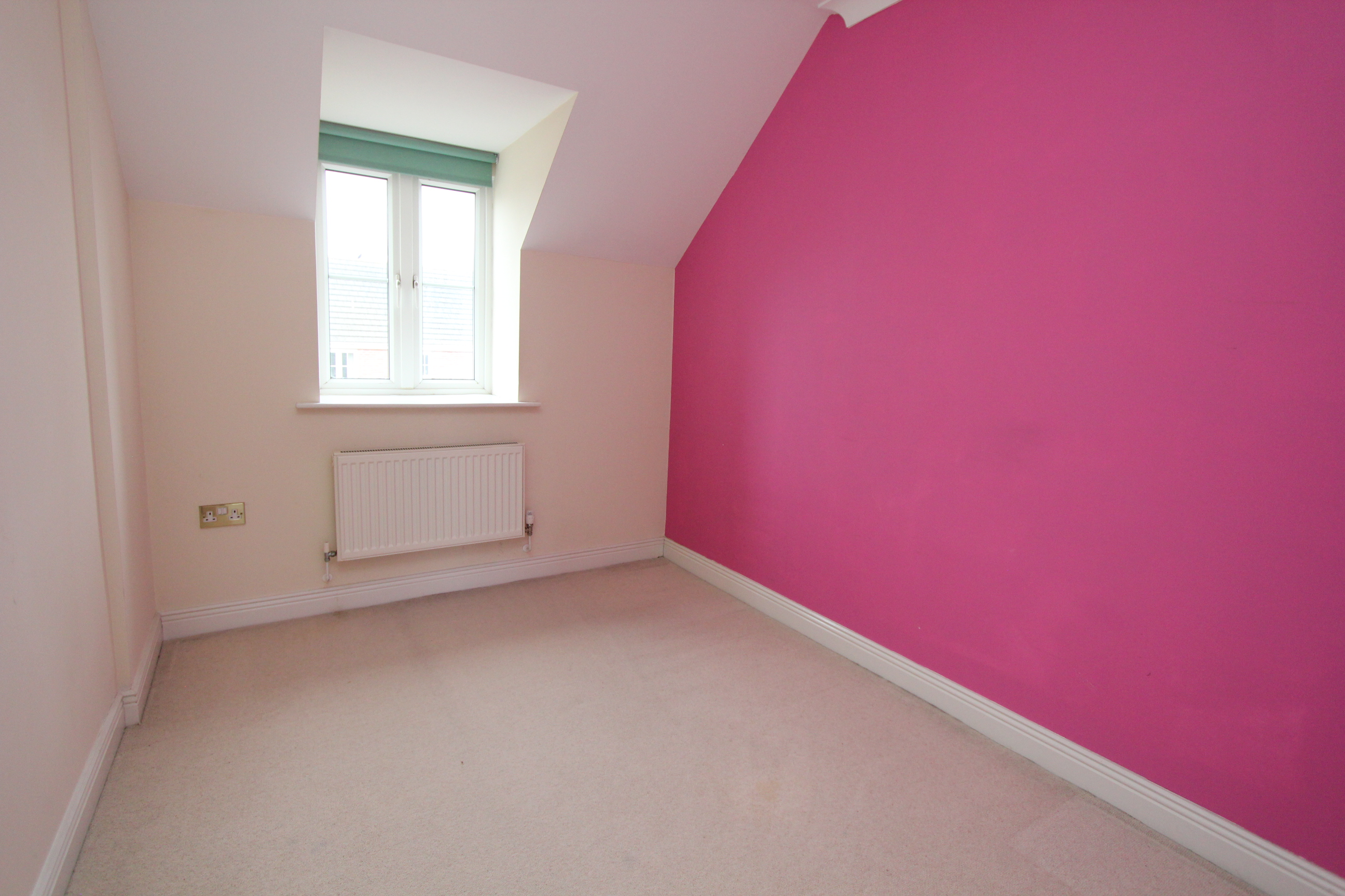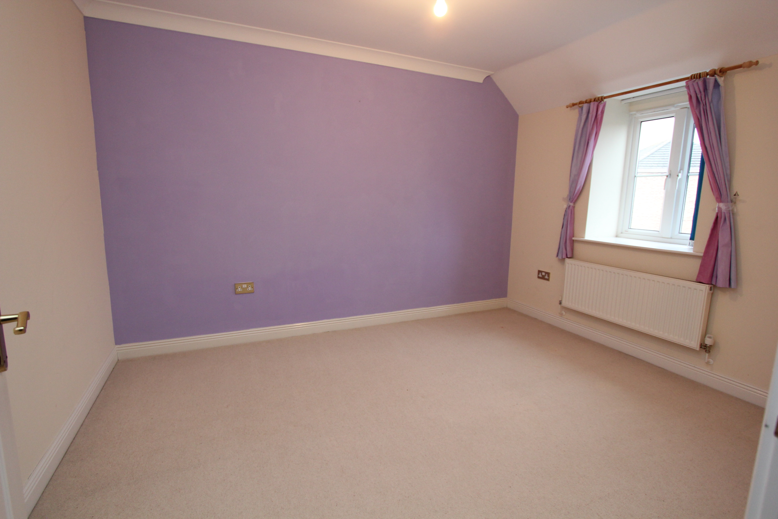 A carpeted double bedroom with front window with a deep sill. Radiator, smooth coved ceiling and recessed double wardrobe.