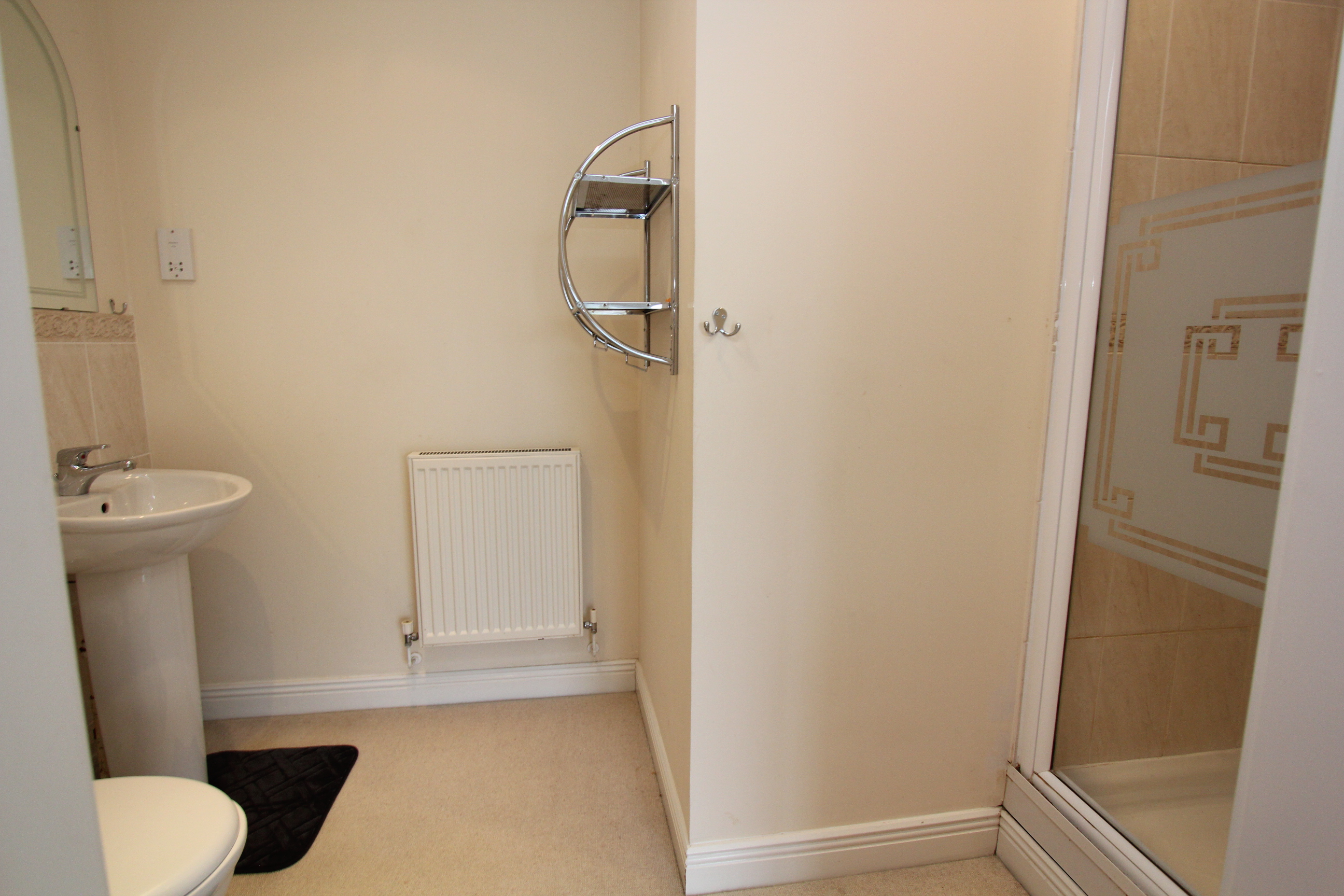 With a white suite comprising close coupled WC, pedestal wash basin and a fully tiled shower cubicle with thermostatic shower inset. Carpeted flooring, ceramic tile splashback and radiator. Shaver point extractor and smooth ceiling with two recessed spotlights.