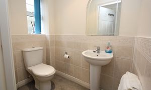 An L shaped room with white suite comprising a close coupled WC, pedestal wash basin and fully tiled shower cubicle with thermostatic shower inset. Radiator, carpeted flooring and ceramic tiled splashbacks. Smooth ceiling with three recessed spotlights and an extractor. Shaver point.