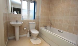 With a white suite comprising close coupled WC, pedestal basin and twin grip bath with a mixer shower attachment off the tap. Obscure glazed front window with a tiled sill matching the splashbacks. Carpeted flooring, radiator, extractor, shaver point and a large handy storage cupboard. Smooth ceiling with two recessed spotlights.