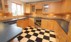 Initially this room has a laminated flooring and French style doors giving access to the enclosed rear garden. There is space for a table and chairs. Radiator. Open access leads to the kitchen which is fitted with a comprehensive range of cherry wood style eye level and base units with display cabinets. These are complemented by modern work service areas which have a 1.5 bowl stainless steel sink unit with mixer tap over. Integrated appliances include a four ring gas hob with double oven and grill under plus extractor hood over. Further integrated dishwasher, fridge and freezer plus a freestanding washing machine can stay if required. There is a stylish ceramic tiled feature flooring, further rear window with ceramic tile seal matching the splashback and finally a concealed boiler (serviced November 2025) which fires the gas central heating. The room has a smooth ceiling with four recessed spotlights.