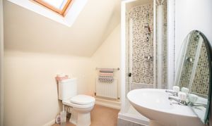 With carpet flooring, shower cubicle, toilet, wash basin on pedestal and Velux-style window.