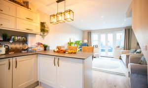 With laminate flooring, shaker style kitchen, integrated appliances, Belfast sink and tap, breakfast bar and window.