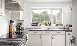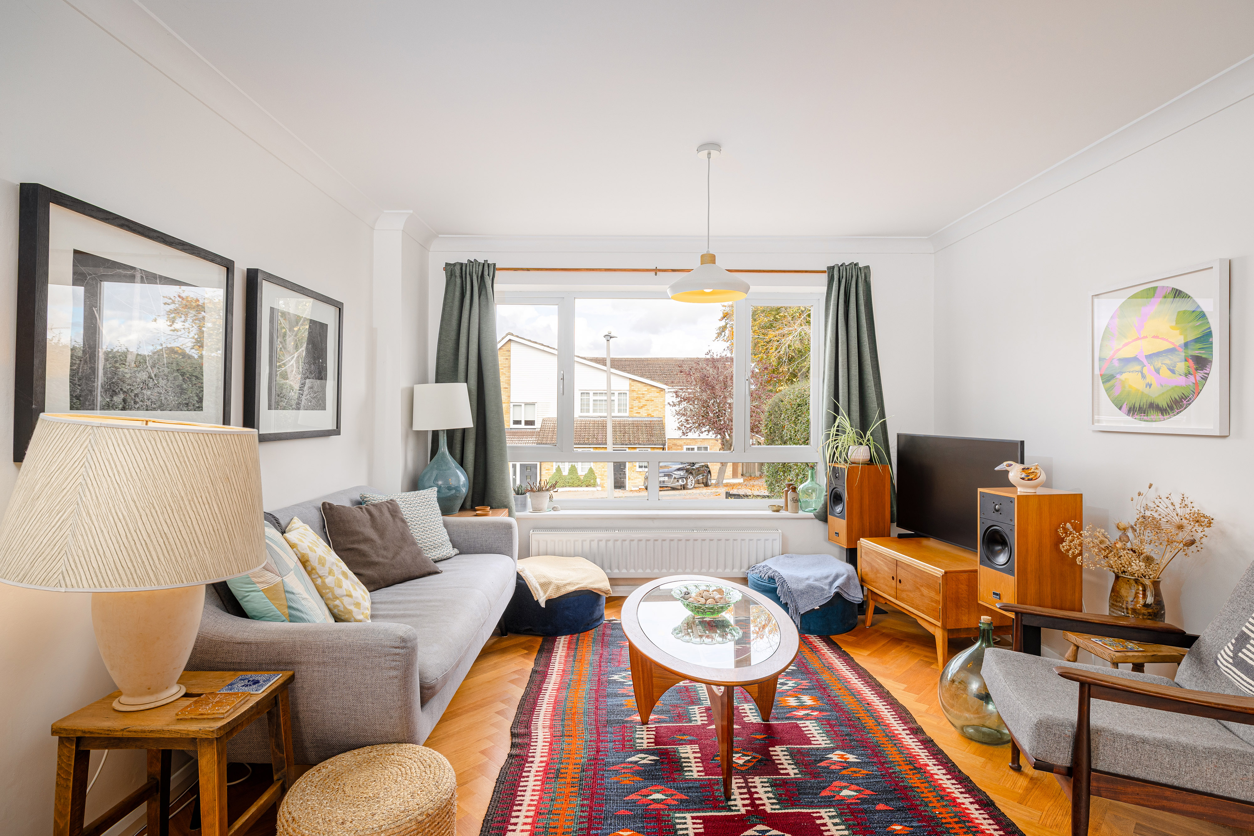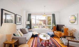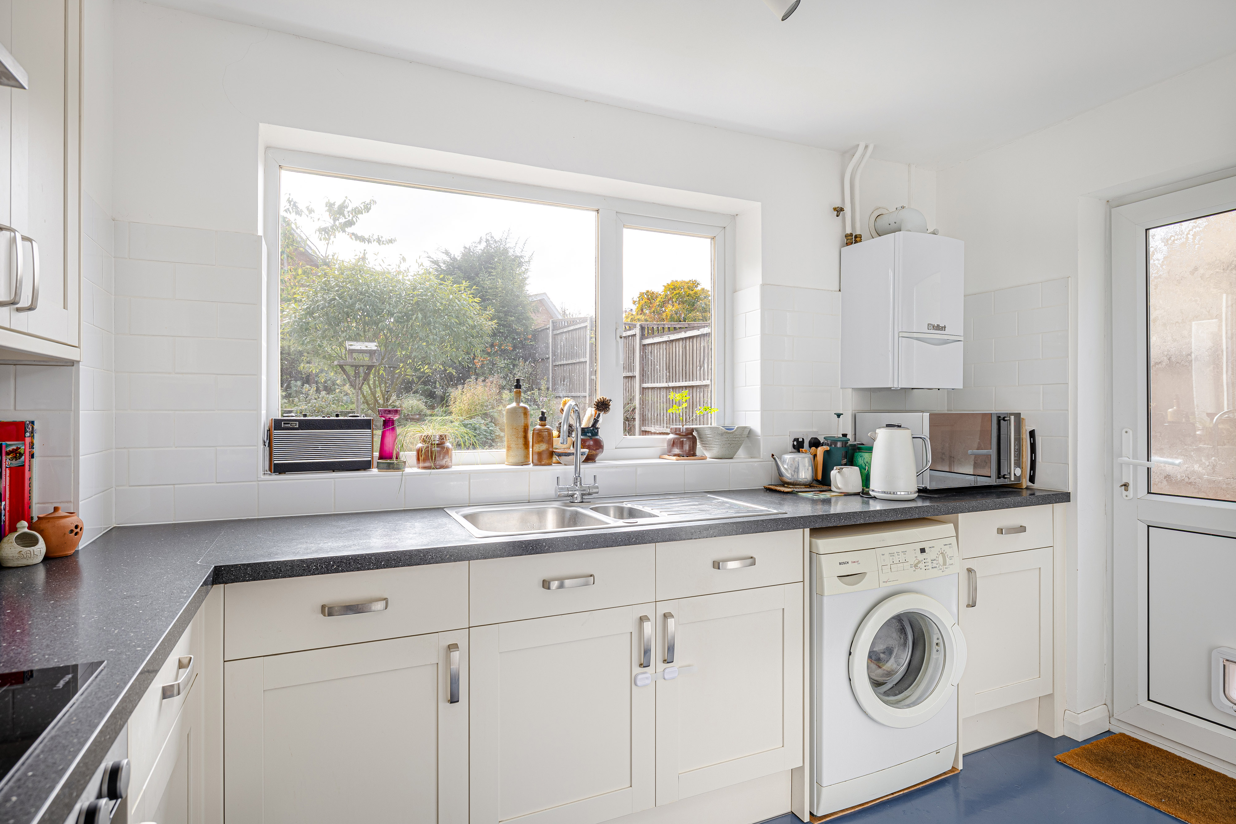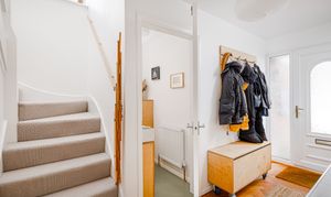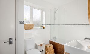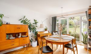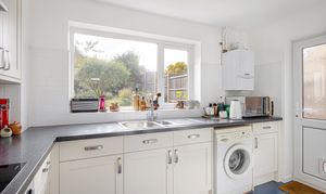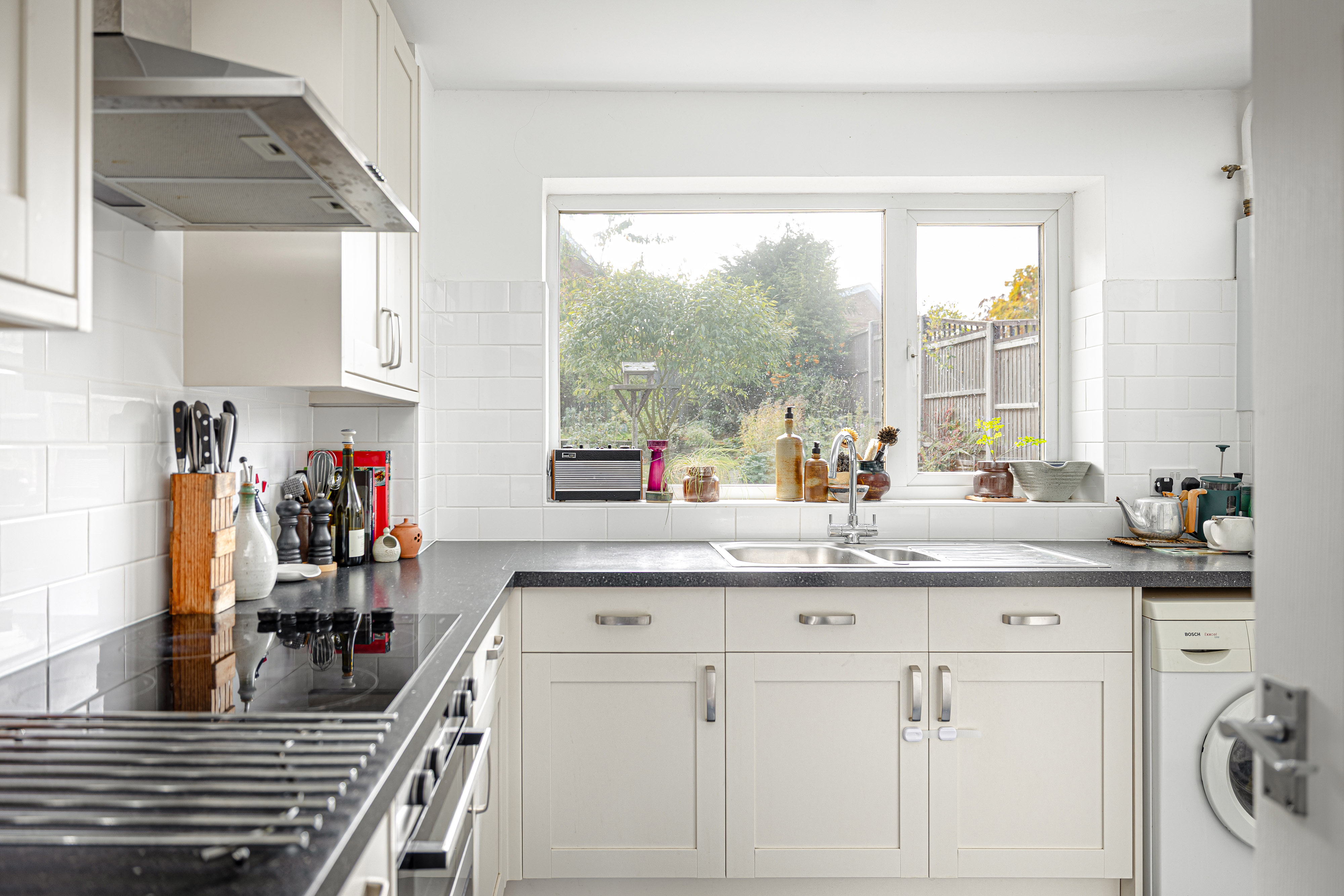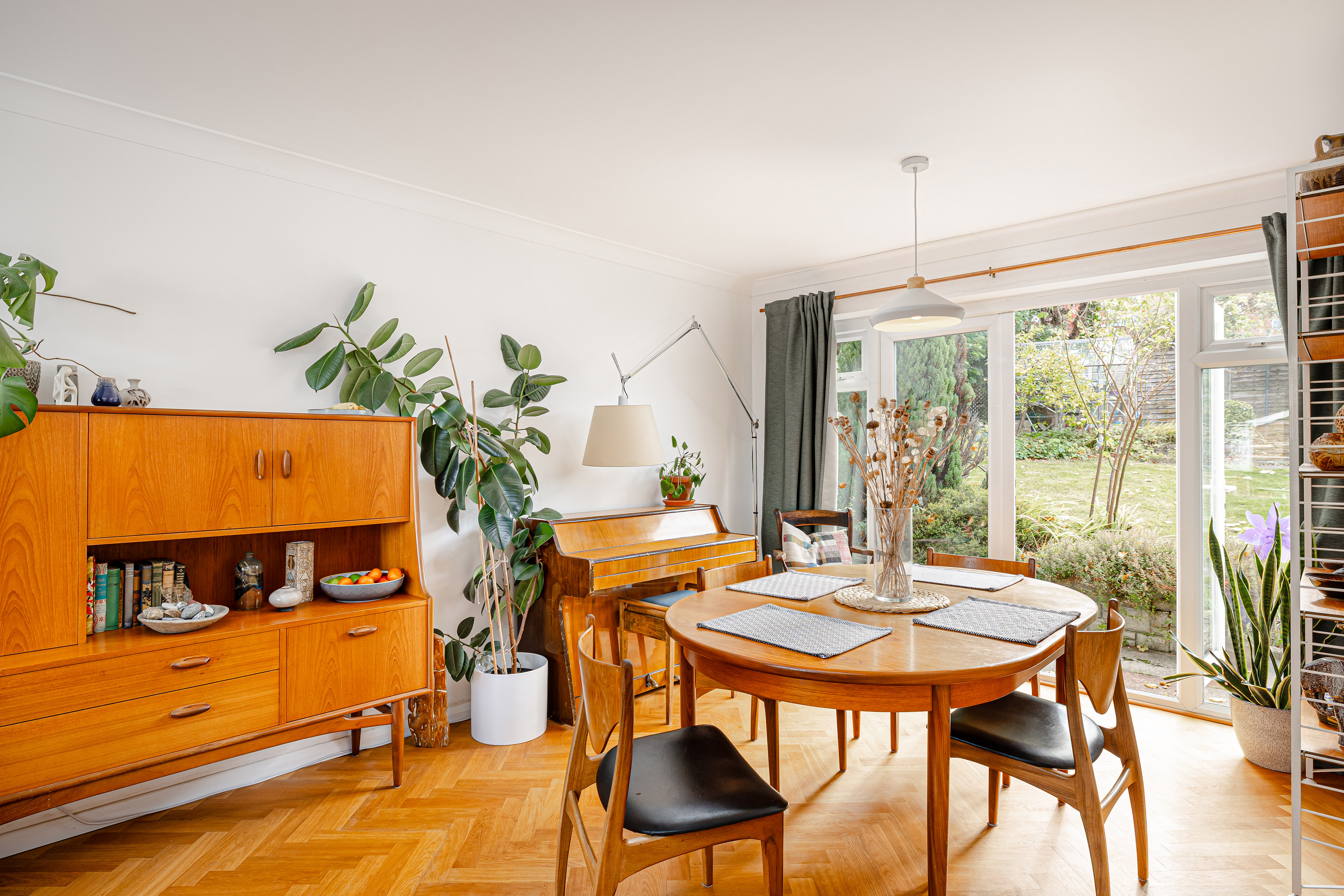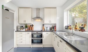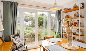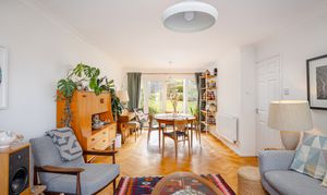 The ground floor opens into an inviting entrance hall with herringbone-style flooring and a cloakroom. The bright dual-aspect sitting and dining room is a standout feature, with its large picture window to the front and French doors opening directly to the garden. This flowing space enjoys a sunny aspect and provides the perfect setting for both family life and entertaining. The contemporary kitchen is fitted with cream shaker-style cabinetry, an integrated oven and hob, and enjoys an attractive garden outlook, with a side door providing easy access outdoors.