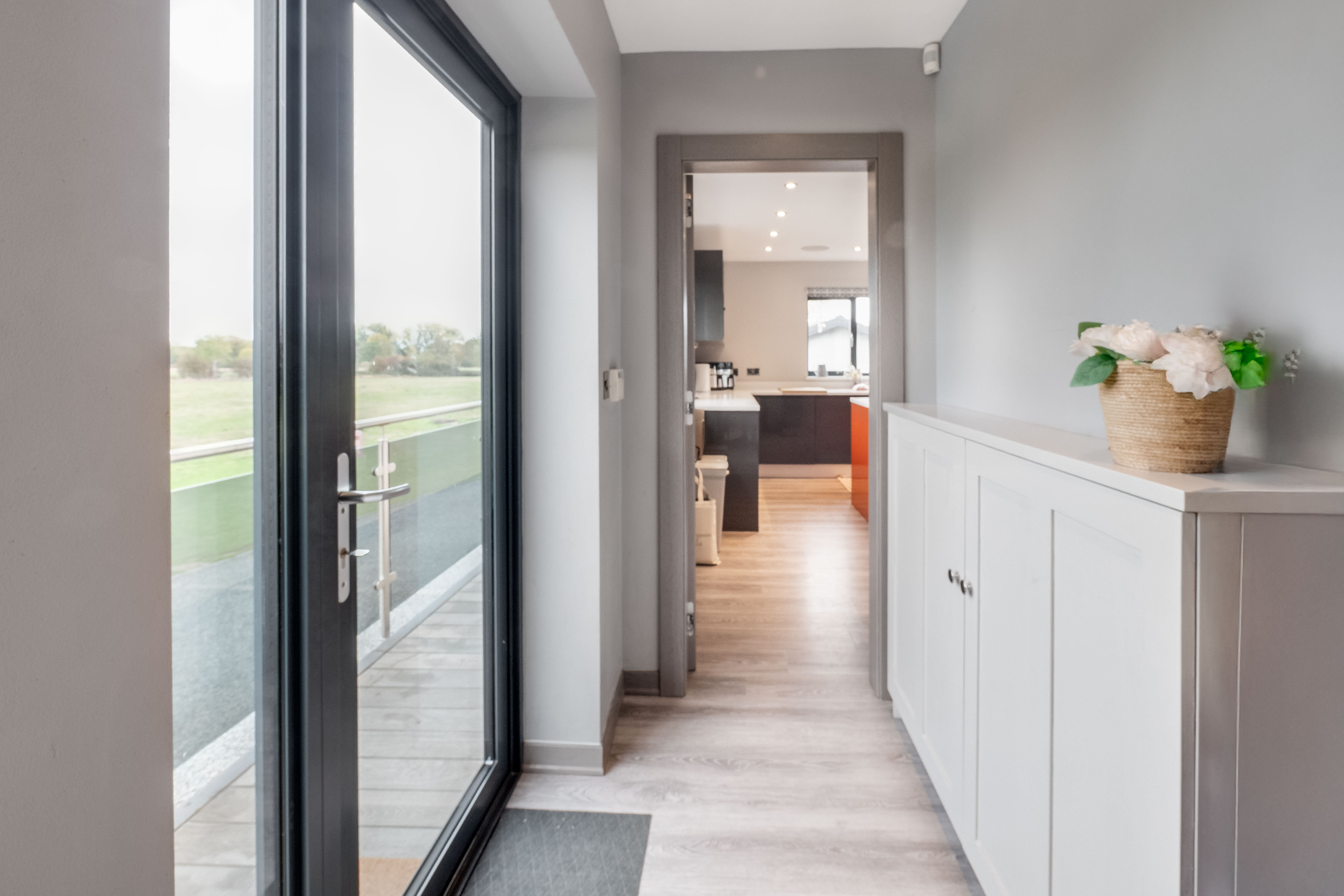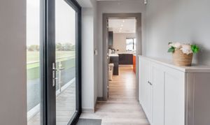 On the ground floor, a light-filled hallway leads through to the heart of the home, a generous living room perfectly positioned to enjoy garden and field views. The kitchen sits opposite, designed for sociable cooking and dining with direct access to the outside, creating a seamless connection between indoors and out. A versatile bedroom or study offers flexibility for guests or home working, served by a sleek bathroom and convenient utility access.