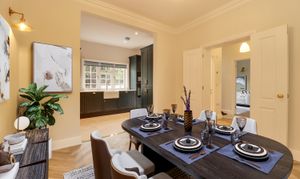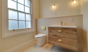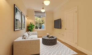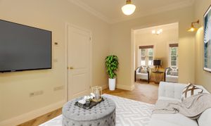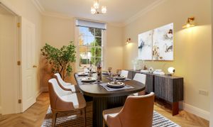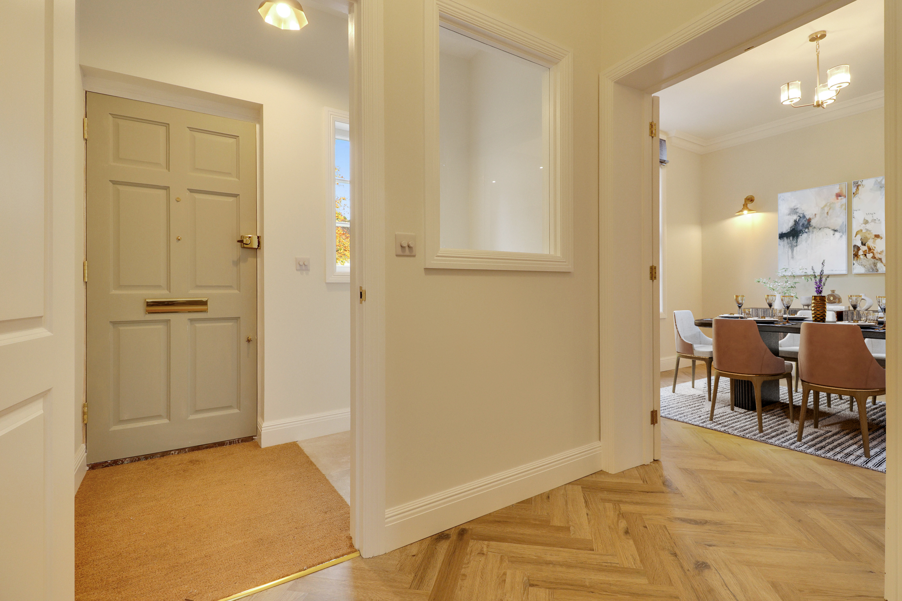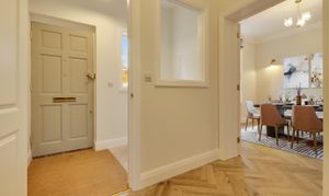 The internal porch welcomes you into this luxurious abode, setting the scene for the grandeur that awaits within. Stepping inside, you are greeted by the exquisite herringbone flooring that leads you through the thoughtfully designed open-plan dining room, seamlessly flowing into the brand new kitchen fitted with high-end appliances and opulent marble worktops. The brand new windows flood the space with natural light, highlighting the original character that has been carefully maintained throughout.