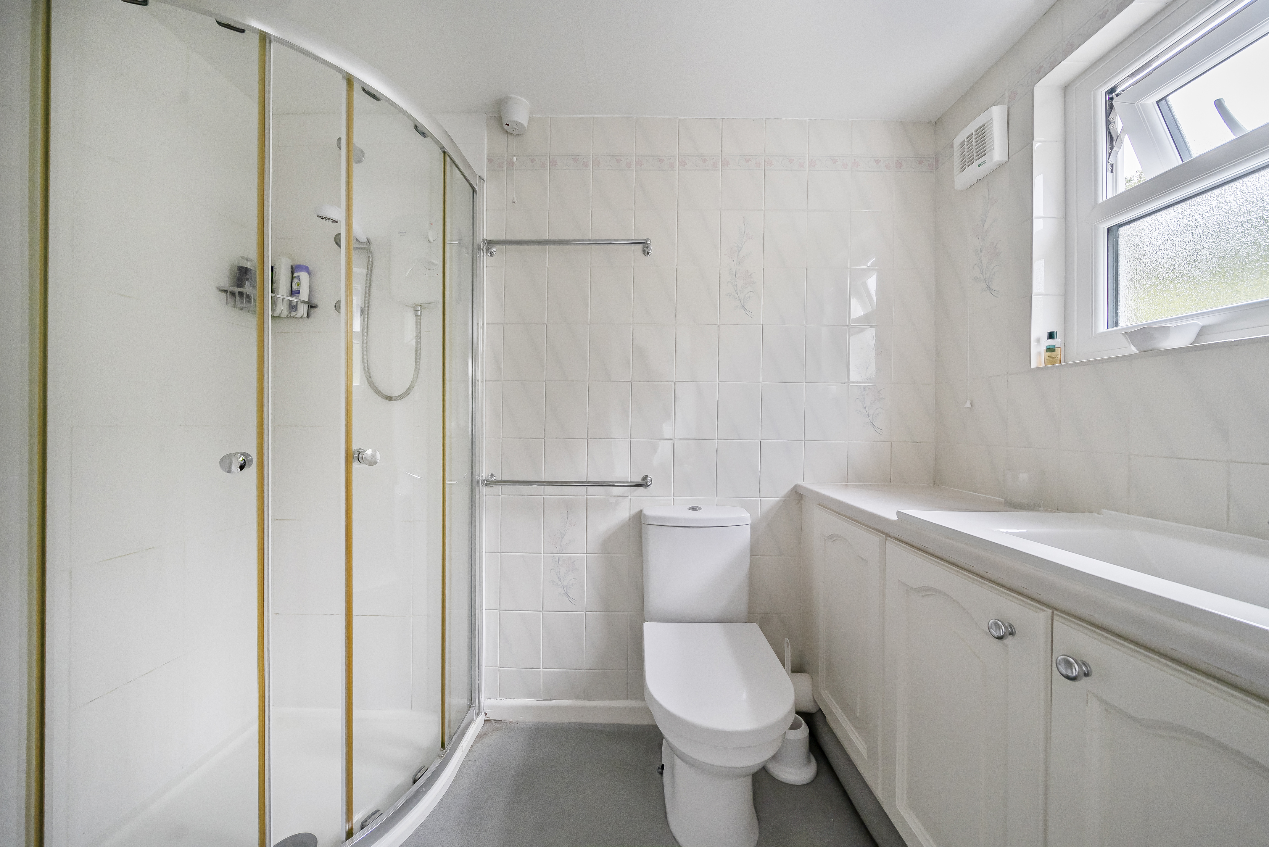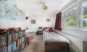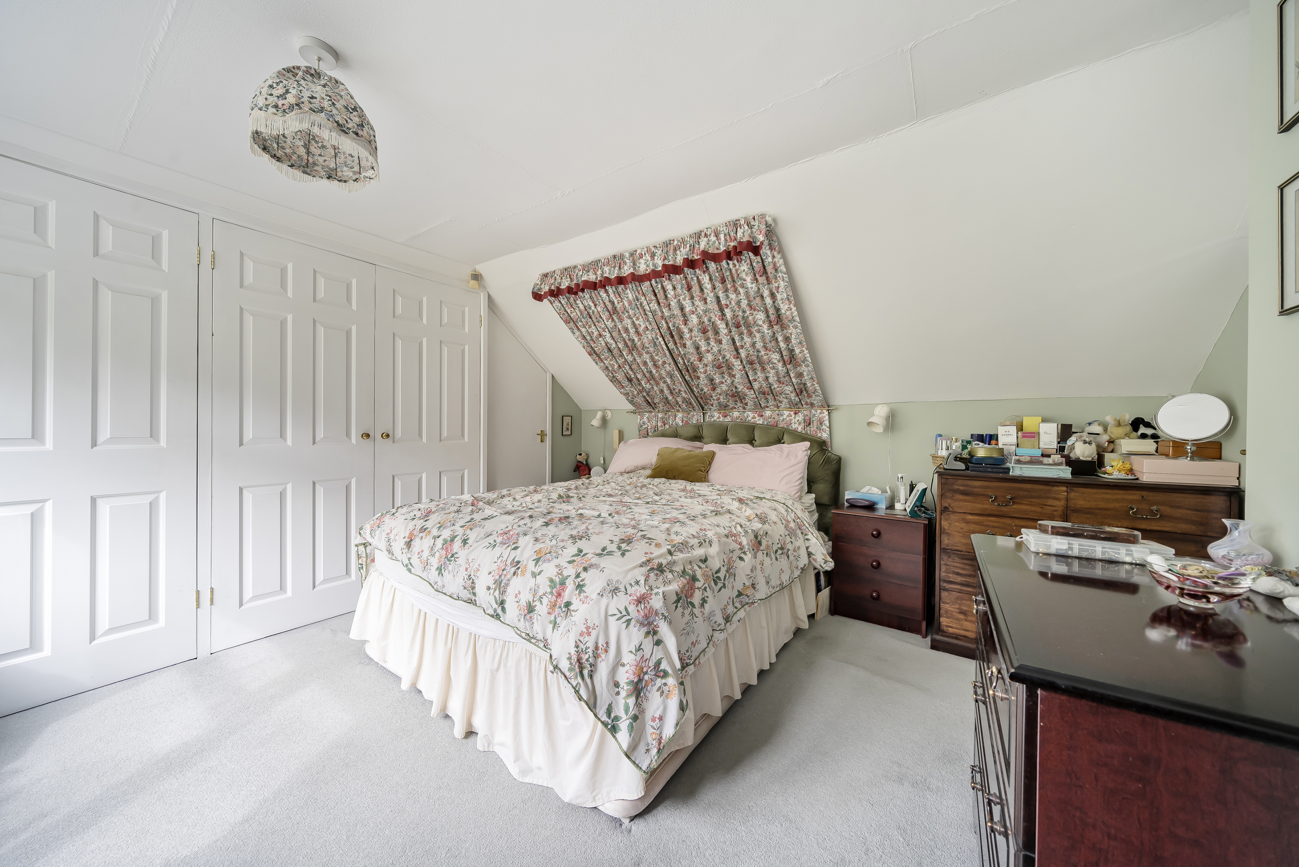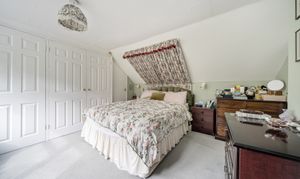 Upstairs, a bright landing with a Velux window creates a pleasant space. Straight ahead is the principal bedroom with fitted wardrobes, eaves storage, and a private en-suite shower room. A further large L-shaped double bedroom enjoys a dual aspect, including garden views and a Velux window framing the surrounding scenery. This room also features fitted wardrobes and additional built-in storage.