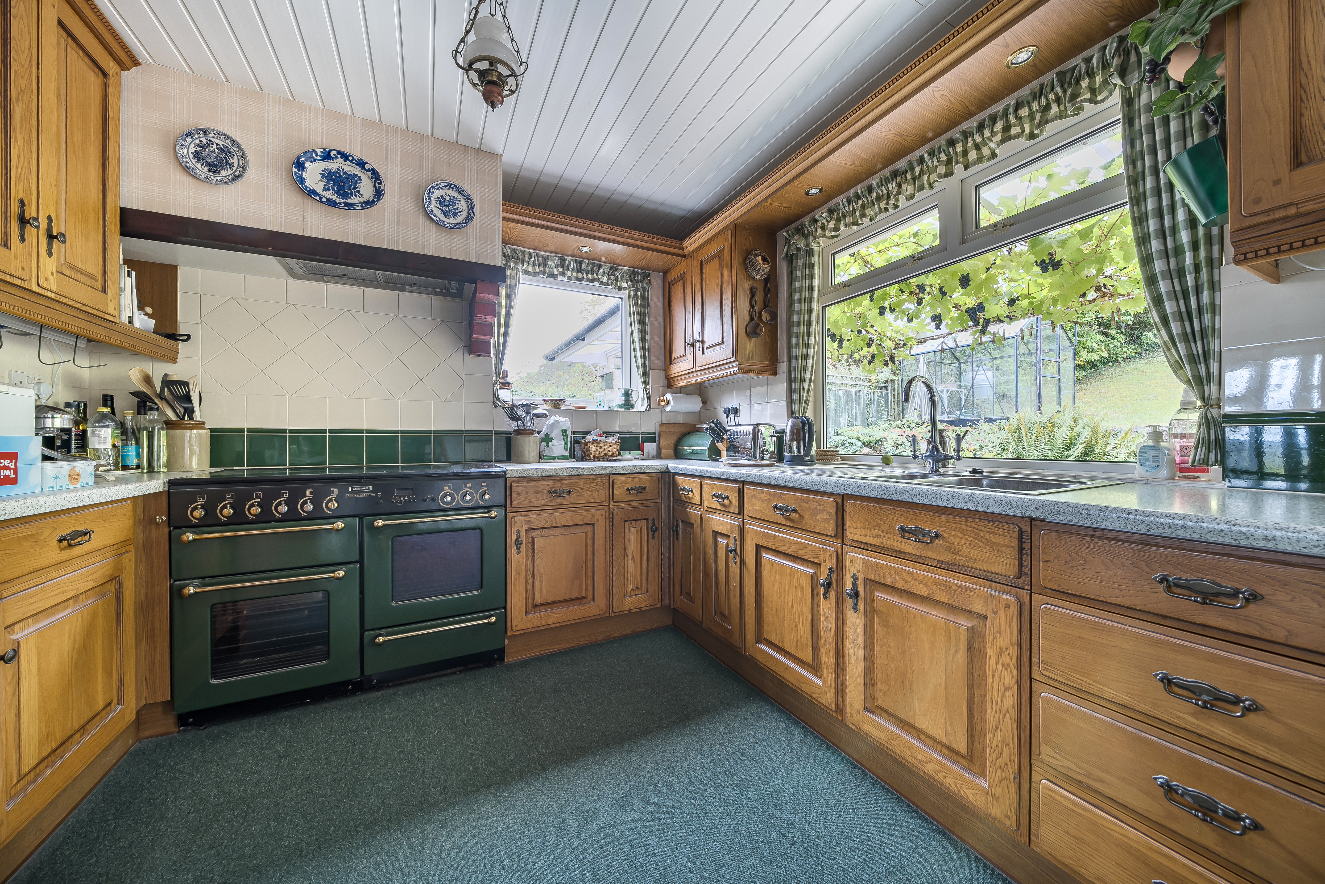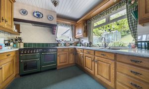 The kitchen is fitted with solid oak units and offers space for a Rangemaster-style cooker. A utility area accommodates a washing machine, tumble dryer, and dishwasher, while a walk-in pantry provides ample storage. A window and rear door allow for garden access and natural light.