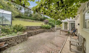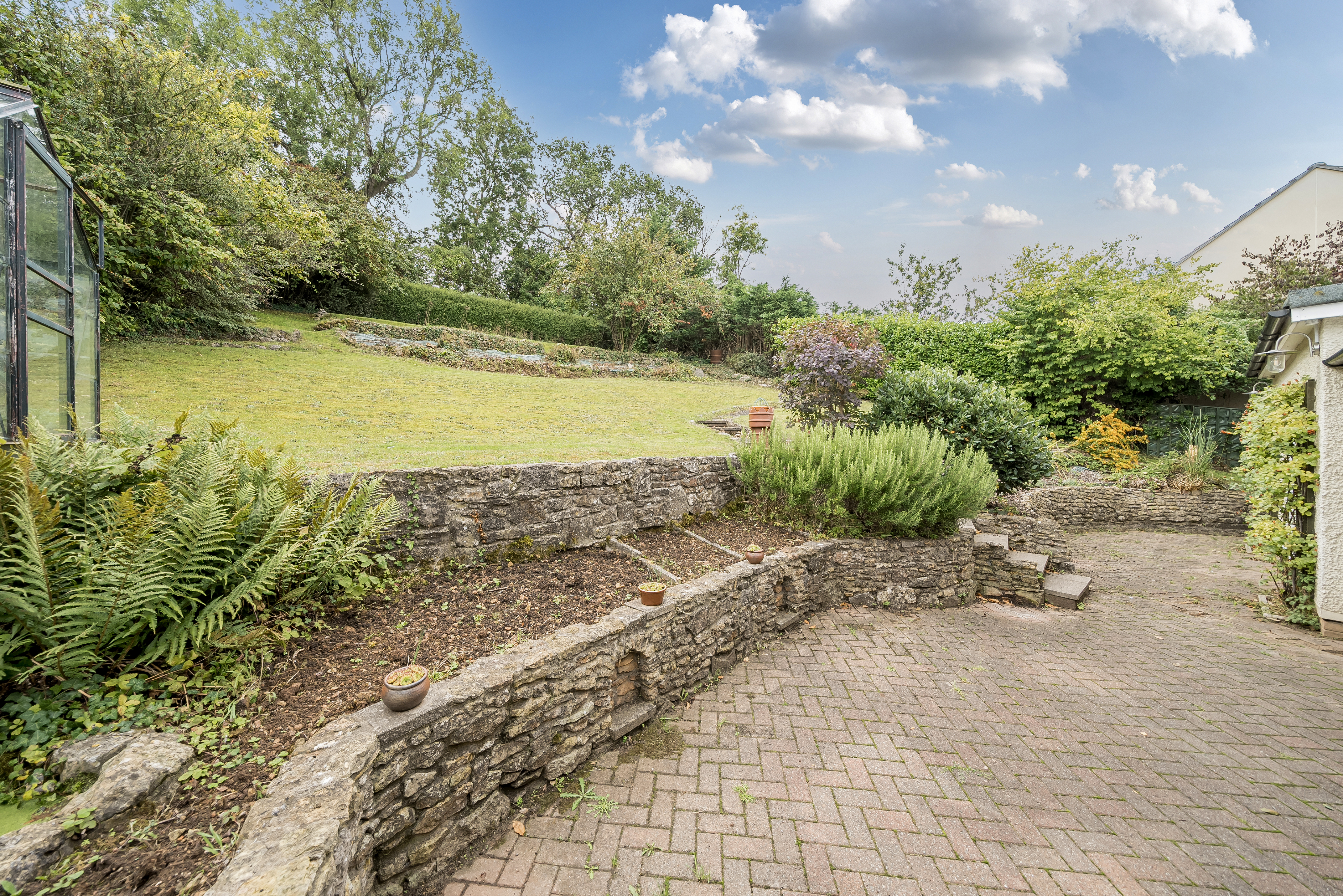 The outdoor space is a standout feature, with a spacious rear patio partially covered by a canopy and draped in a mature grapevine, perfect for year-round use. Flowerbeds, a pond and a feature wall border the patio, with steps leading up to a terraced lawn with panoramic countryside views. The garden also offers a greenhouse, powered shed, stone outbuilding with electricity, and side access.