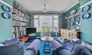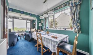 Approached via steps to a covered porch, the front door opens into a hallway giving access to the main living areas. To the left is a spacious reception room, currently used as a dining room and snug area, with a large window framing far reaching views. A door connects to the kitchen, with potential to create a bright, open plan layout.