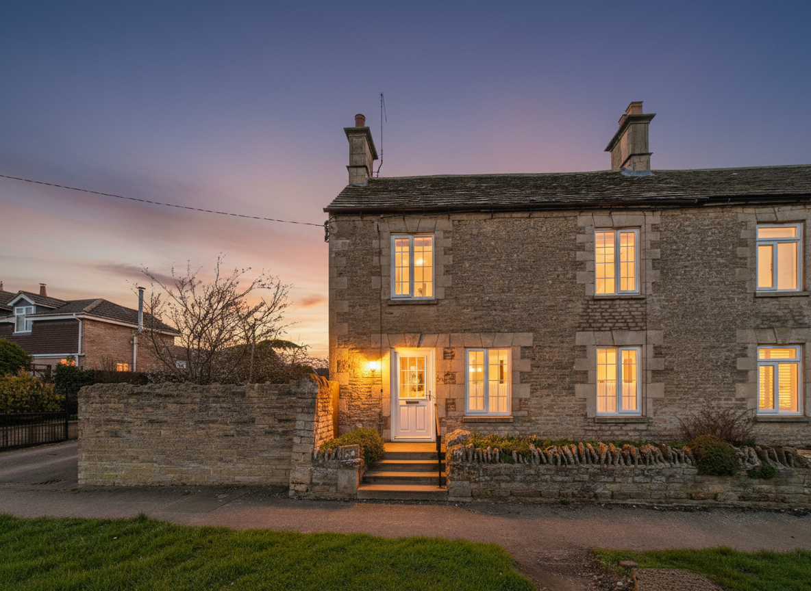 A stone-built semi-detached Georgian cottage located on Stamford Road in Easton on the Hill, with views over open countryside.