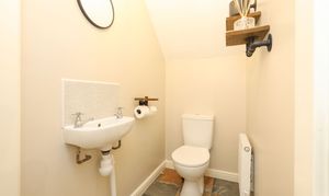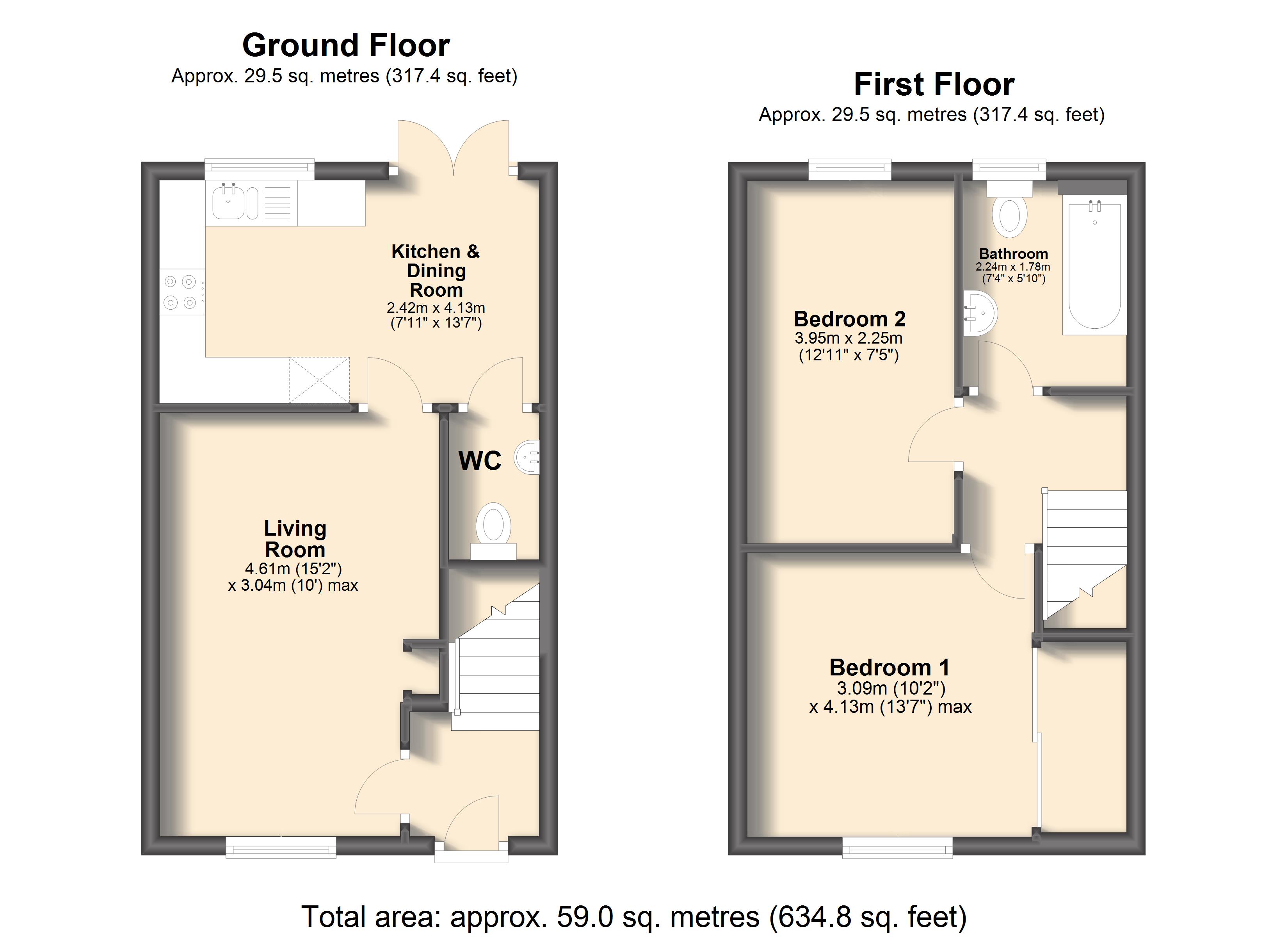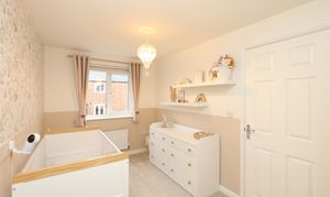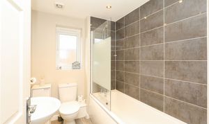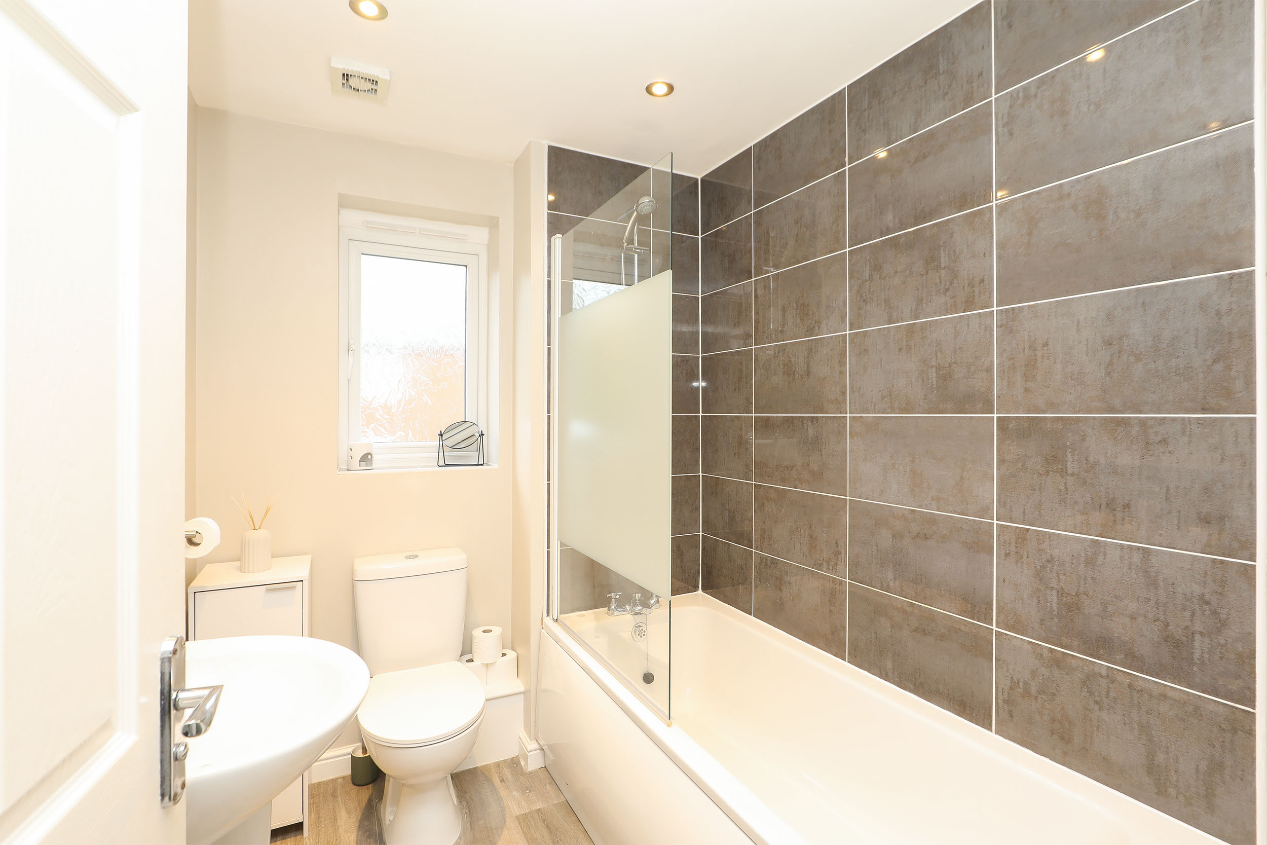 The first floor hosts two generously sized double bedrooms, each beautifully presented. The principal bedroom benefits from fitted wardrobes, while the second bedroom offers excellent flexibility as a guest room, nursery, or home office space. A stylish family bathroom equipped with a contemporary three-piece suite serves the bedrooms.