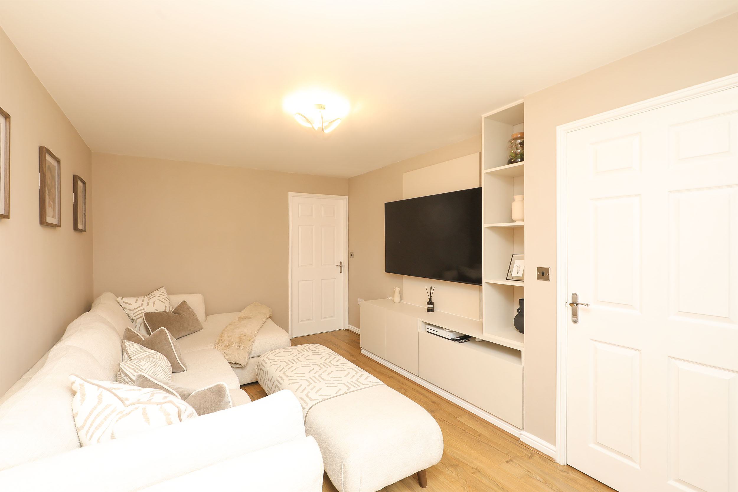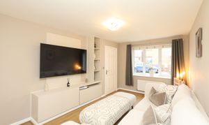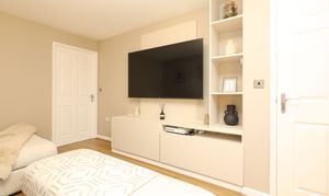 Upon entering, you are welcomed into a bright and inviting entranceway that showcases the high standard of presentation and attention to detail found throughout the property. The beautifully designed living room enjoys a bespoke media wall and an abundance of natural light, creating an elegant yet comfortable space for relaxation. To the rear of the property, the open-plan kitchen and dining room provide a fantastic space, thoughtfully designed with a range of integrated cooking appliances and doors that open onto the fabulous rear garden. This versatile space is ideal for both everyday living and entertaining guests. Completing the ground floor is a convenient W/C, adding practicality to the home’s modern layout.