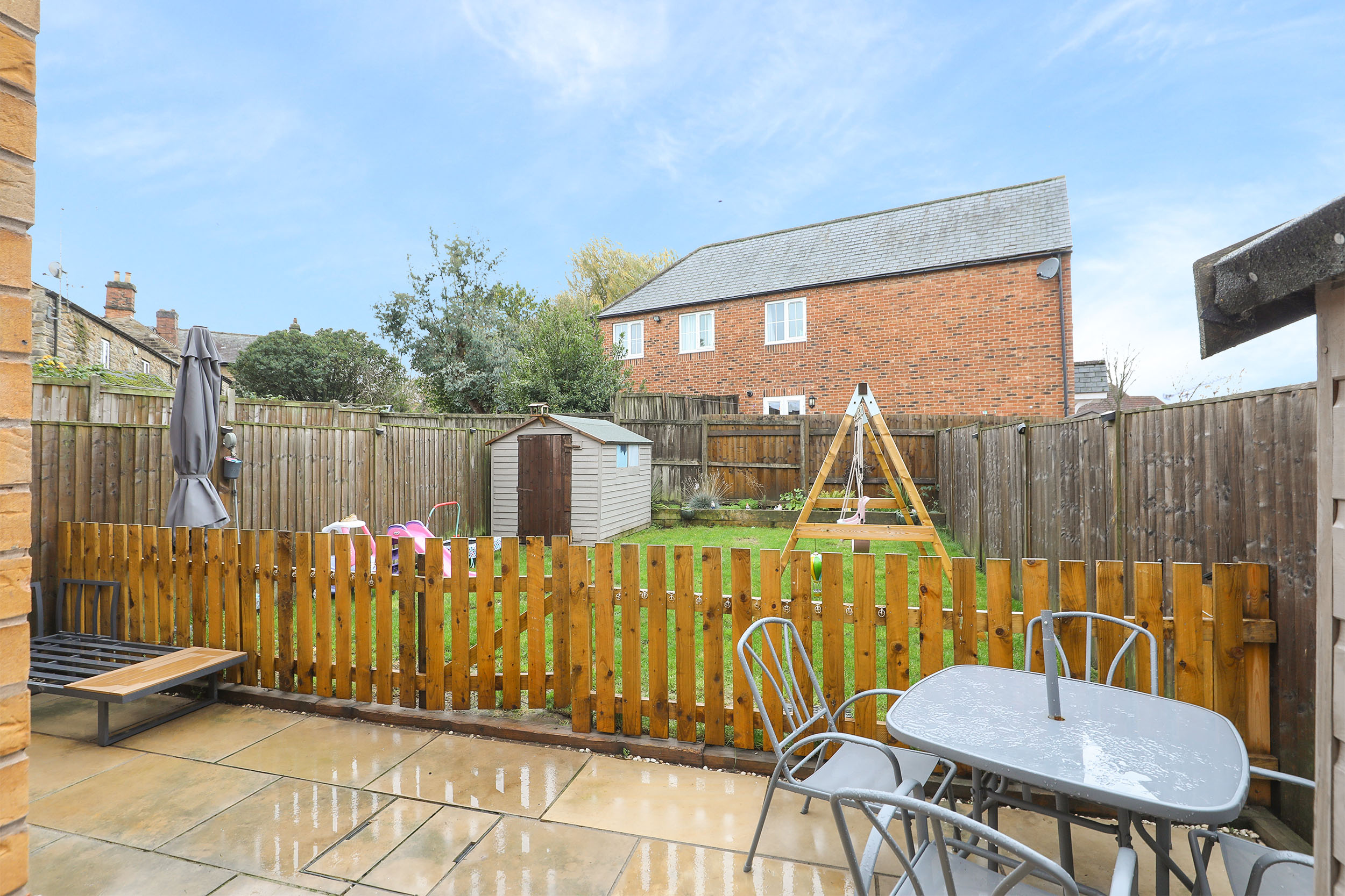The rear garden has been superbly landscaped to create two distinct areas: a generous patio space, perfect for outdoor dining and summer gatherings, and an enclosed lawn area, ideal for children to play safely or for those who enjoy relaxing outdoors. To the side of the property, the driveway provides a convenient off-road parking space.